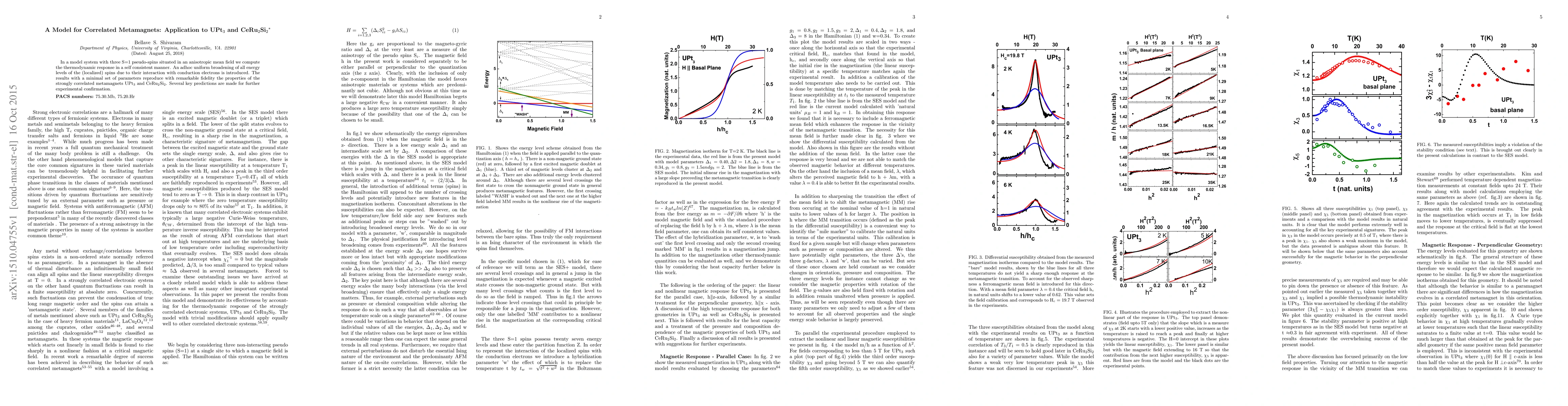 In a model system with three S=1 pseudo-spins situated in an anisotropic mean field we compute the thermodynamic response in a self consistent manner. An adhoc uniform broadening of all energy levels of the (localized) spins due to their interaction with conduction electrons is introduced. The results with a minimal set of parameters reproduce with remarkable fidelity the properties of the strongly correlated metamagnets UPt$_3$ and CeRu$_2$Si$_2$. Several key predictions are made for further experimental confirmation.