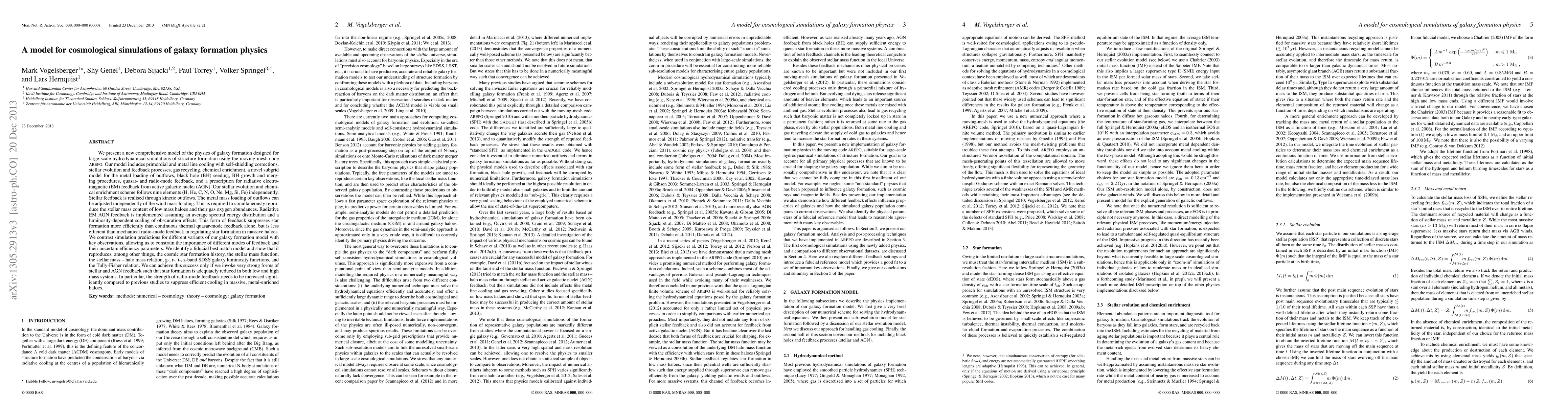 We present a new comprehensive model of the physics of galaxy formation designed for large-scale hydrodynamical simulations of structure formation using the moving mesh code AREPO. Our model includes primordial and metal line cooling with self-shielding corrections, stellar evolution and feedback processes, gas recycling, chemical enrichment, a novel subgrid model for the metal loading of outflows, black hole (BH) seeding, BH growth and merging procedures, quasar- and radio-mode feedback, and a prescription for radiative electro-magnetic (EM) feedback from active galactic nuclei (AGN). The metal mass loading of outflows can be adjusted independently of the wind mass loading. This is required to simultaneously reproduce the stellar mass content of low mass haloes and their gas oxygen abundances. Radiative EM AGN feedback is implemented assuming an average spectral energy distribution and a luminosity-dependent scaling of obscuration effects. This form of feedback suppresses star formation more efficiently than continuous thermal quasar-mode feedback alone, but is less efficient than mechanical radio-mode feedback in regulating star formation in massive haloes. We contrast simulation predictions for different variants of our galaxy formation model with key observations. Our best match model reproduces, among other things, the cosmic star formation history, the stellar mass function, the stellar mass - halo mass relation, g-, r-, i-, z-band SDSS galaxy luminosity functions, and the Tully-Fisher relation. We can achieve this success only if we invoke very strong forms of stellar and AGN feedback such that star formation is adequately reduced in both low and high mass systems. In particular, the strength of radio-mode feedback needs to be increased significantly compared to previous studies to suppress efficient cooling in massive, metal-enriched haloes.
