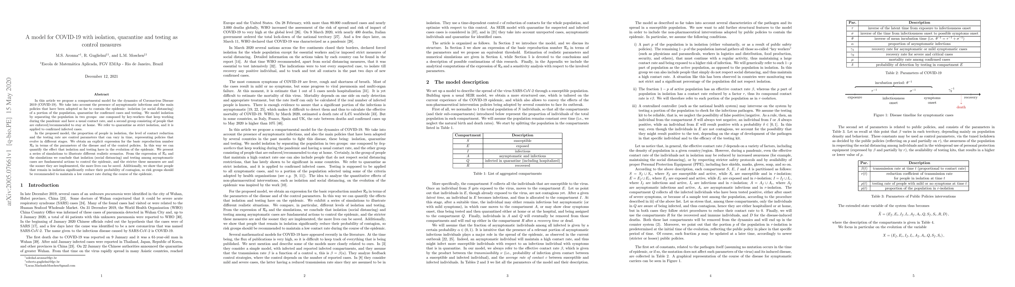 In this article we propose a compartmental model for the dynamics of Coronavirus Disease 2019 (COVID-19). We take into account the presence of asymptomatic infections and the main policies that have been adopted so far to contain the epidemic: isolation (or social distancing) of a portion of the population, quarantine for confirmed cases and testing. We model isolation by separating the population in two groups: one composed by key-workers that keep working during the pandemic and have a usual contact rate, and a second group consisting of people that are enforced/recommended to stay at home. We refer to quarantine as strict isolation, and it is applied to confirmed infected cases. In the proposed model, the proportion of people in isolation, the level of contact reduction and the testing rate are control parameters that can vary in time, representing policies that evolve in different stages. We obtain an explicit expression for the basic reproduction number $\mathcal{R}_0$ in terms of the parameters of the disease and of the control policies. In this way we can quantify the effect that isolation and testing have in the evolution of the epidemic. We present a series of simulations to illustrate different realistic scenarios. From the expression of $\mathcal{R}_0$ and the simulations we conclude that isolation (social distancing) and testing among asymptomatic cases are fundamental actions to control the epidemic, {and the stricter these measures are and the sooner they are implemented,} the more lives can be saved. Additionally, we show that people that remain in isolation significantly reduce their probability of contagion, so risk groups should be recommended to maintain a low contact rate during the course of the epidemic.
