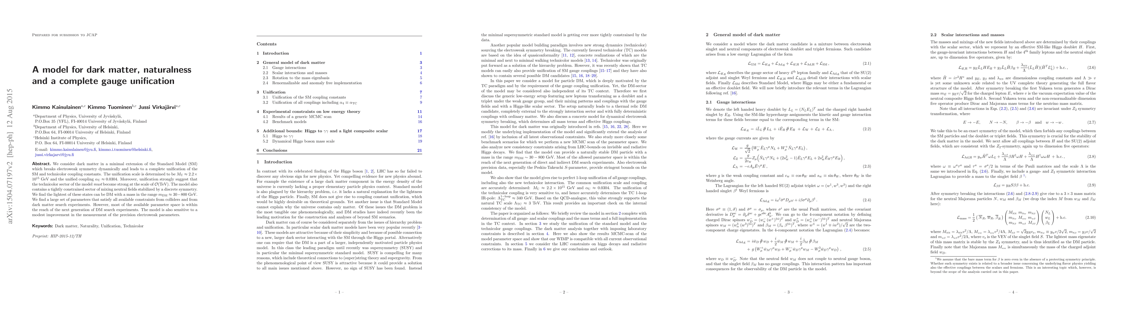 We consider dark matter in a minimal extension of the Standard Model (SM) which breaks electroweak symmetry dynamically and leads to a complete unification of the SM and technicolor coupling constants. The unification scale is determined to be $M_{\rm U} \approx 2.2 \times 10^{15}$ GeV and the unified coupling $\alpha_{\rm U} \approx 0.0304$. Moreover, unification strongly suggest that the technicolor sector of the model must become strong at the scale of ${\cal O}$(TeV). The model also contains a tightly constrained sector of mixing neutral fields stabilized by a discrete symmetry. We find the lightest of these states can be DM with a mass in the range $m_{\rm DM} \approx 30-800$ GeV. We find a large set of parameters that satisfy all available constraints from colliders and from dark matter search experiments. However, most of the available parameter space is within the reach of the next generation of DM search experiments. The model is also sensitive to a modest improvement in the measurement of the precision electroweak parameters.