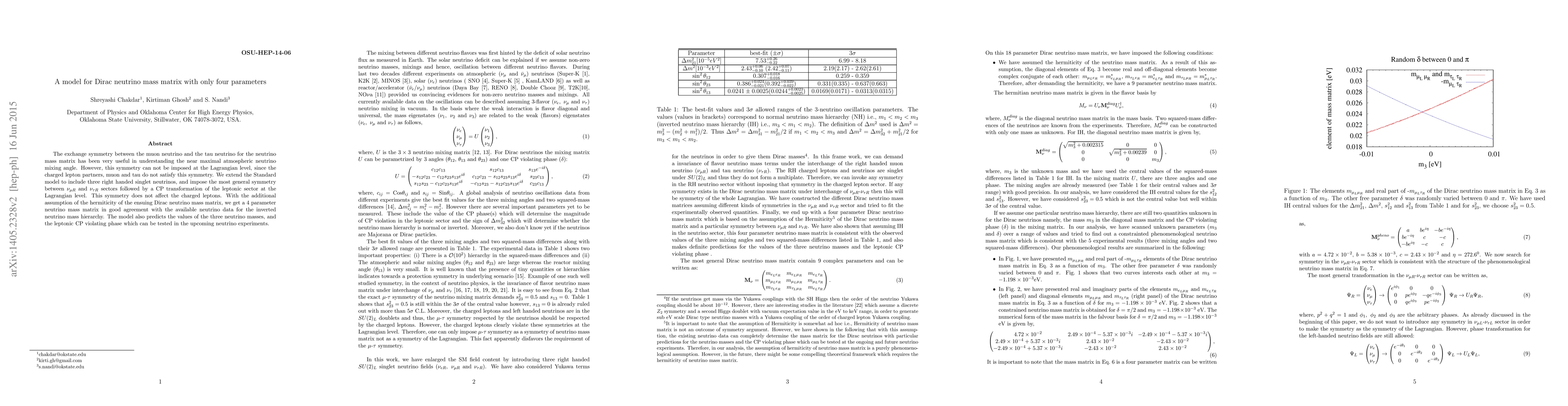 The exchange symmetry between the muon neutrino and the tau neutrino for the neutrino mass matrix has been very useful in understanding the near maximal atmospheric neutrino mixing angle. However, this symmetry can not be imposed at the Lagrangian level, since the charged lepton partners, muon and tau do not satisfy this symmetry. We extend the Standard model to include three right handed singlet neutrinos, and impose the most general symmetry between $\nu_{\mu R} $ and $\nu_{\tau R}$ sectors followed by a CP transformation of the leptonic sector at the Lagrangian level. This symmetry does not affect the charged leptons. With the additional assumption of the hermiticity of the ensuing Dirac neutrino mass matrix, we get a 4 parameter neutrino mass matrix in good agreement with the available neutrino data for the inverted neutrino mass hierarchy. The model also predicts the values of the three neutrino masses, and the leptonic CP violating phase which can be tested in the upcoming neutrino experiments.