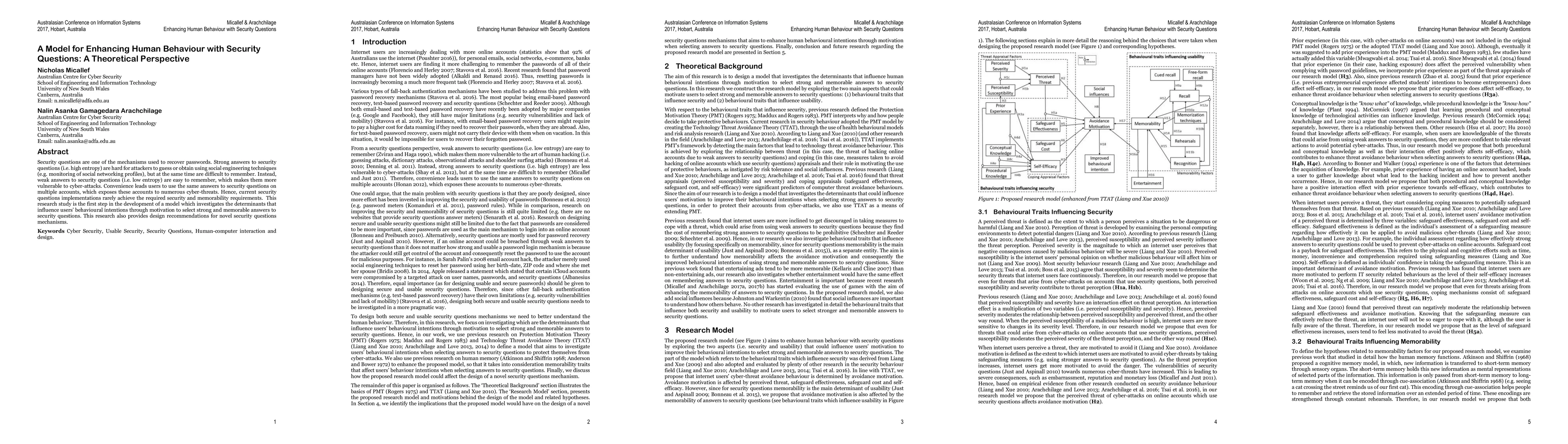 Security questions are one of the mechanisms used to recover passwords. Strong answers to security questions (i.e. high entropy) are hard for attackers to guess or obtain using social engineering techniques (e.g. monitoring of social networking profiles), but at the same time are difficult to remember. Instead, weak answers to security questions (i.e. low entropy) are easy to remember, which makes them more vulnerable to cyber-attacks. Convenience leads users to use the same answers to security questions on multiple accounts, which exposes these accounts to numerous cyber-threats. Hence, current security questions implementations rarely achieve the required security and memorability requirements. This research study is the first step in the development of a model which investigates the determinants that influence users' behavioural intentions through motivation to select strong and memorable answers to security questions. This research also provides design recommendations for novel security questions mechanisms.