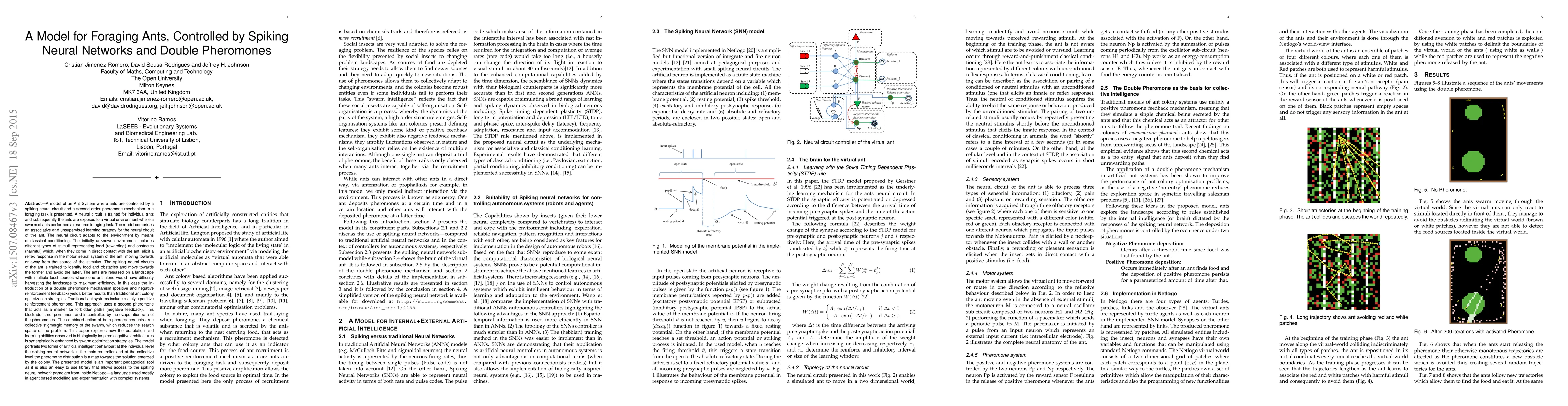 This paper presents a model of foraging ants controlled by spiking neural networks and a dual pheromone system, demonstrating improved efficiency over traditional ant colony optimization. The model employs associative learning and classical conditioning to adapt the neural circuits, while a second pheromone provides negative feedback for forbidden paths, enhancing collective decision-making.