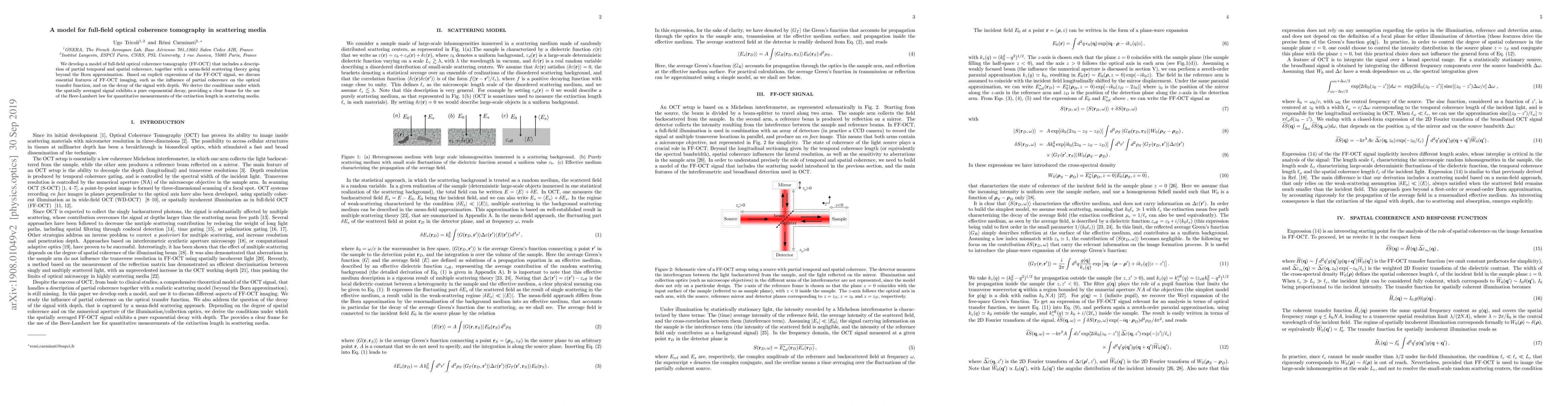 This paper develops a full-field optical coherence tomography (FF-OCT) model that accounts for partial coherence and advanced scattering theory. It provides insights into how partial coherence affects the optical transfer function and signal decay in scattering media, establishing conditions for exponential signal decay and the application of the Beer-Lambert law.