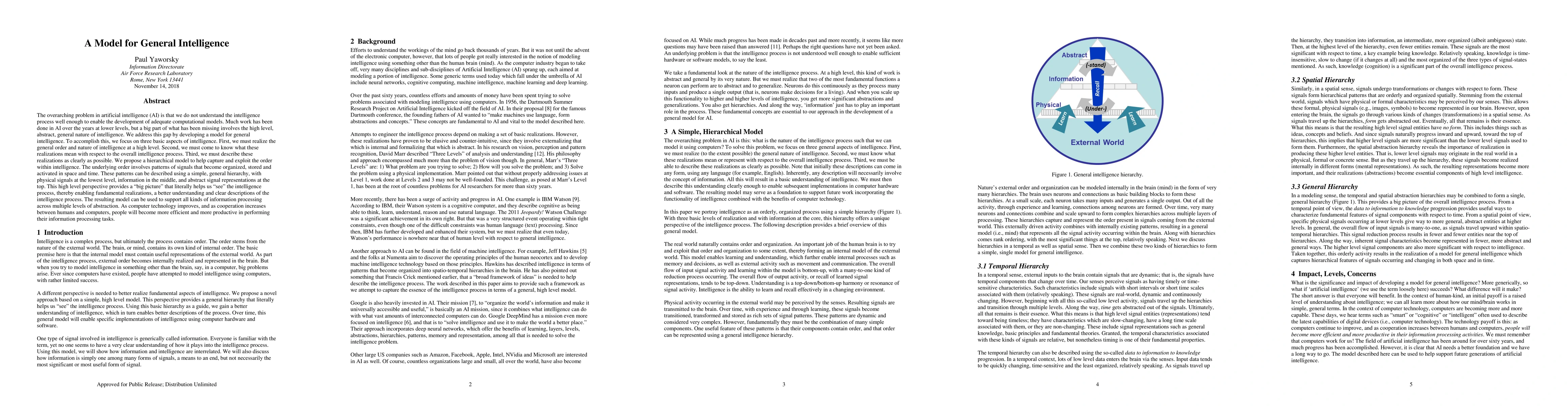 A new model for general intelligence proposes a hierarchical structure for understanding the intelligence process, focusing on patterns of signals that become organized and activated in space and time.