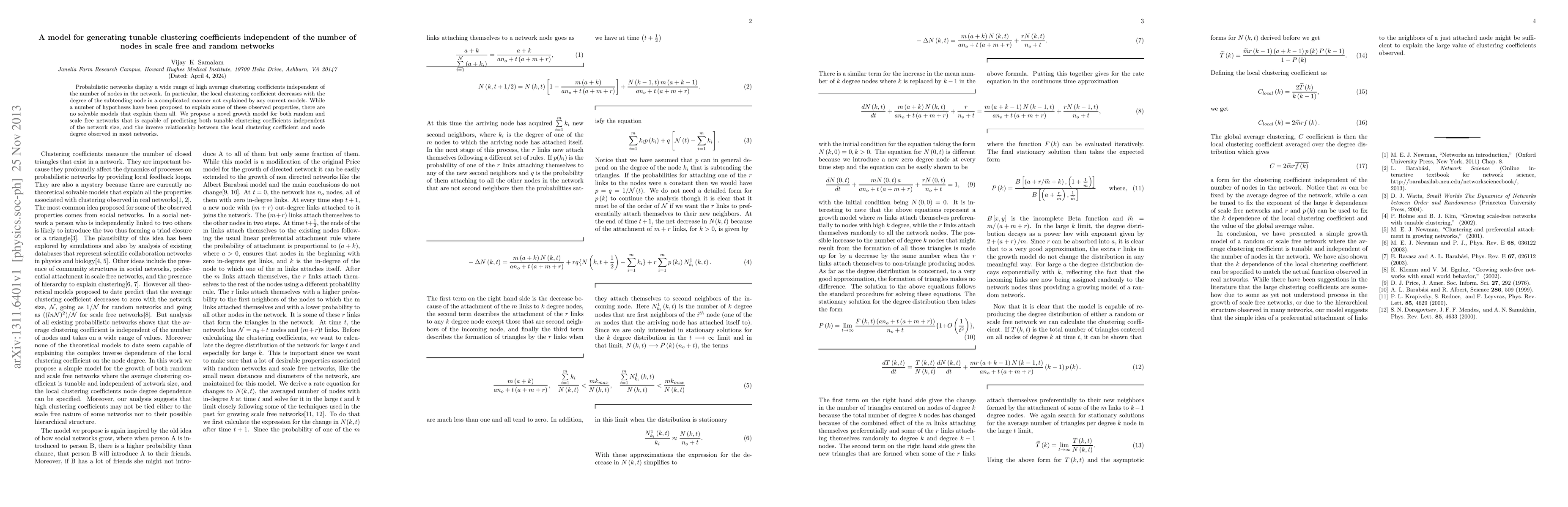 Probabilistic networks display a wide range of high average clustering coefficients independent of the number of nodes in the network. In particular, the local clustering coefficient decreases with the degree of the subtending node in a complicated manner not explained by any current models. While a number of hypotheses have been proposed to explain some of these observed properties, there are no solvable models that explain them all. We propose a novel growth model for both random and scale free networks that is capable of predicting both tunable clustering coefficients independent of the network size, and the inverse relationship between the local clustering coefficient and node degree observed in most networks.