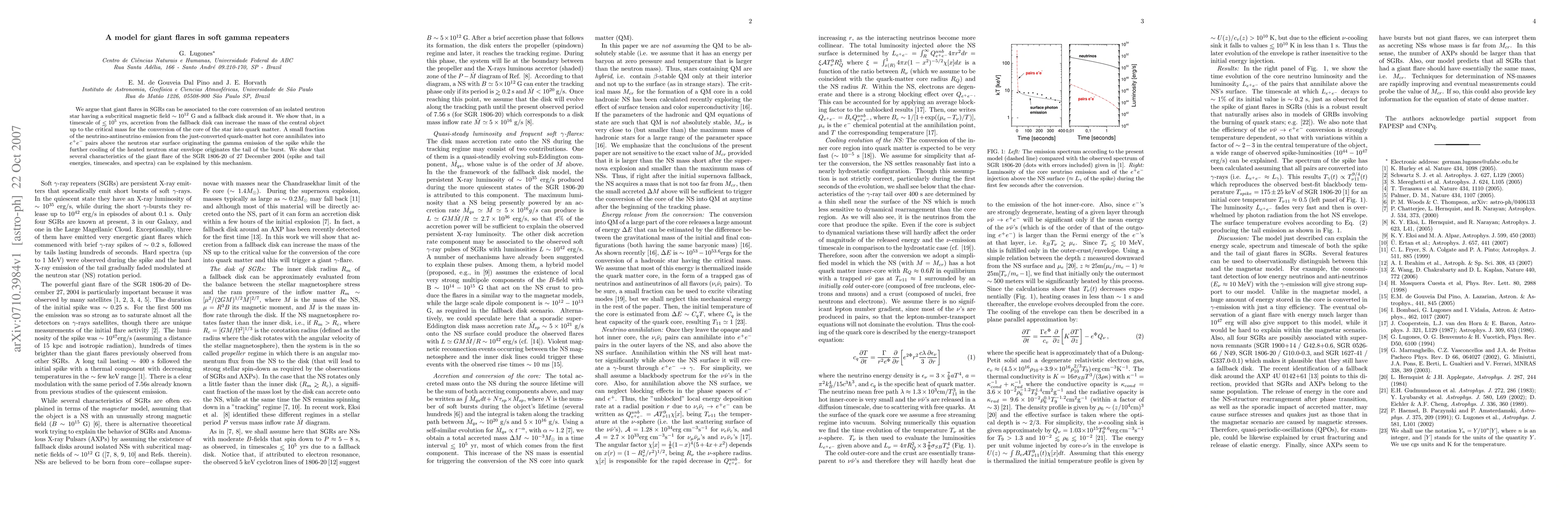 We argue that giant flares in SGRs can be associated to the core conversion of an isolated neutron star having a subcritical magnetic field $\sim 10^{12}$ G and a fallback disk around it. We show that, in a timescale of $\lesssim 10^5$ yrs, accretion from the fallback disk can increase the mass of the central object up to the critical mass for the conversion of the core of the star into quark matter. A small fraction of the neutrino-antineutrino emission from the just-converted quark-matter hot core annihilates into $e^+e^-$ pairs above the neutron star surface originating the gamma emission of the spike while the further cooling of the heated neutron star envelope originates the tail of the burst. We show that several characteristics of the giant flare of the SGR 1806-20 of 27 December 2004 (spike and tail energies, timescales, and spectra) can be explained by this mechanism.