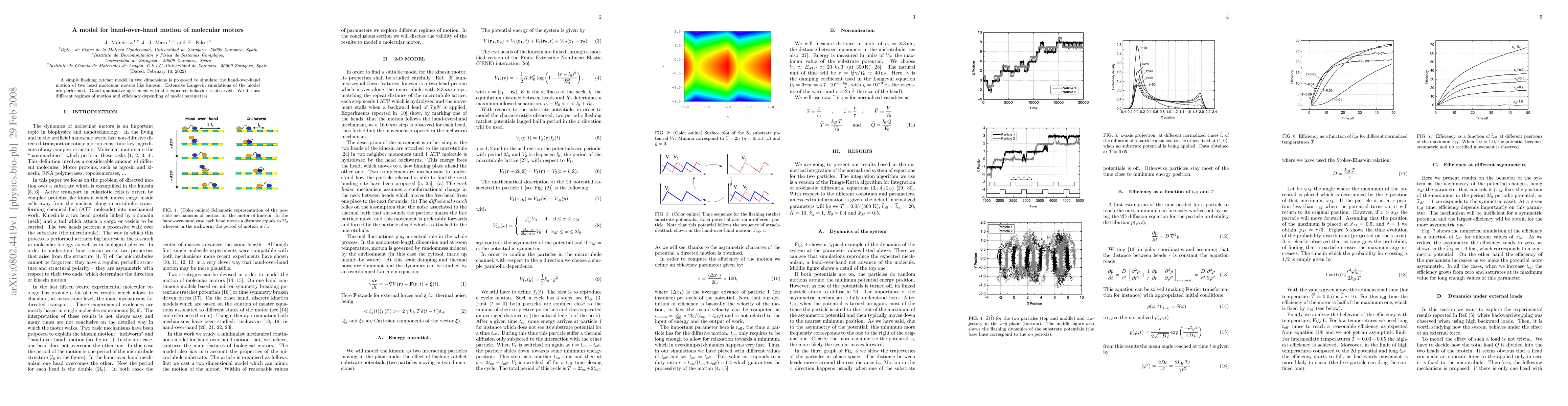 A simple flashing ratchet model in two dimensions is proposed to simulate the hand-over-hand motion of two head molecular motors like kinesin. Extensive Langevin simulations of the model are performed. Good qualitative agreement with the expected behavior is observed. We discuss different regimes of motion and efficiency depending of model parameters.