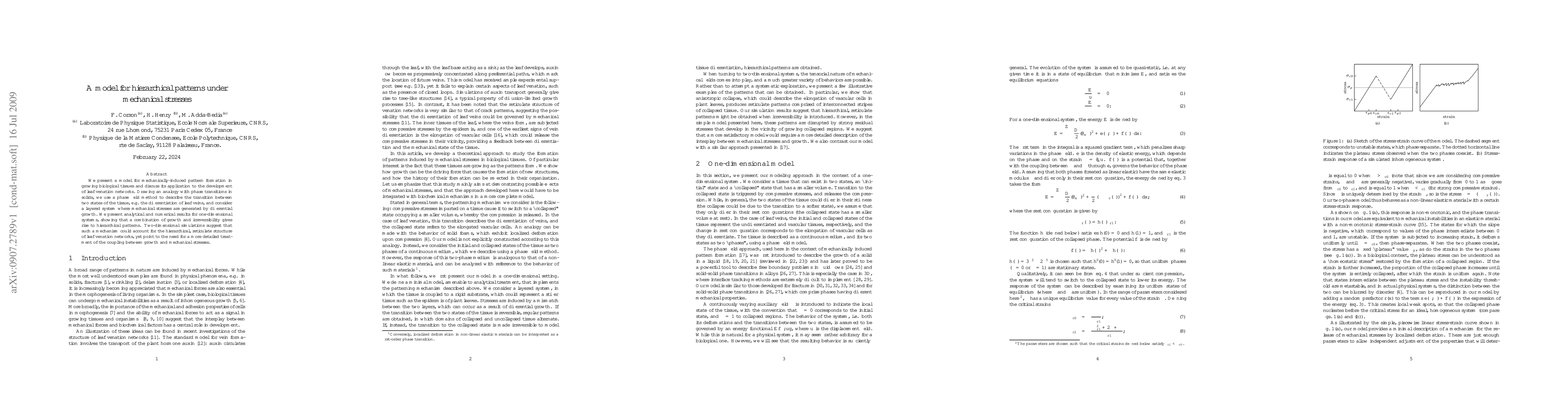 We present a model for mechanically-induced pattern formation in growing biological tissues and discuss its application to the development of leaf venation networks. Drawing an analogy with phase transitions in solids, we use a phase field method to describe the transition between two states of the tissue, e.g. the differentiation of leaf veins, and consider a layered system where mechanical stresses are generated by differential growth. We present analytical and numerical results for one-dimensional systems, showing that a combination of growth and irreversibility gives rise to hierarchical patterns. Two-dimensional simulations suggest that such a mechanism could account for the hierarchical, reticulate structure of leaf venation networks, yet point to the need for a more detailed treatment of the coupling between growth and mechanical stresses.