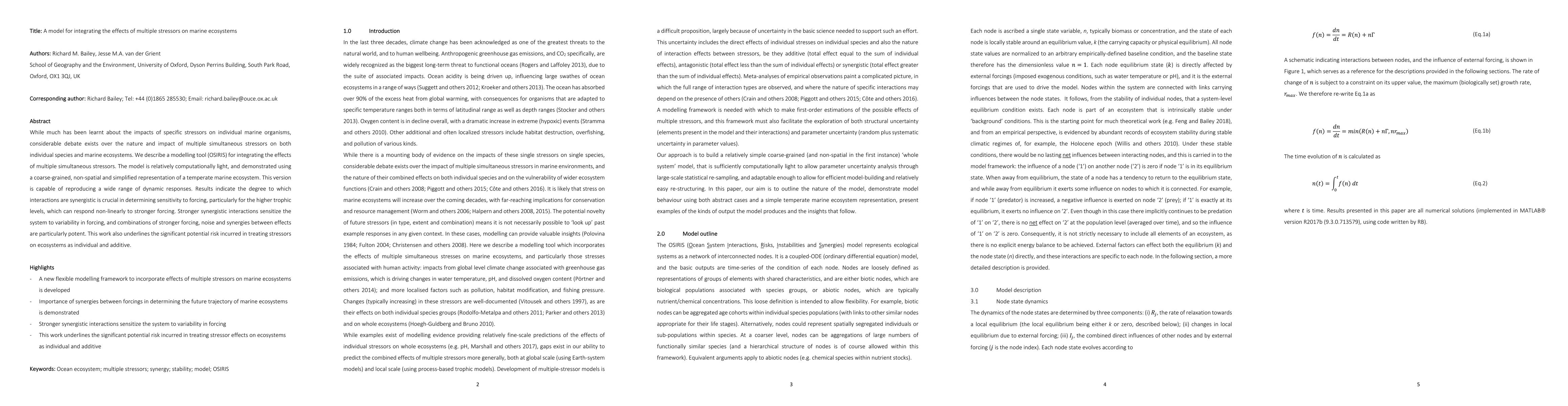 The paper introduces OSIRIS, a computational model that integrates the effects of multiple simultaneous stressors on marine ecosystems. Results show that synergistic interactions between stressors significantly impact higher trophic levels, emphasizing the risk of treating stressors as individual and additive.