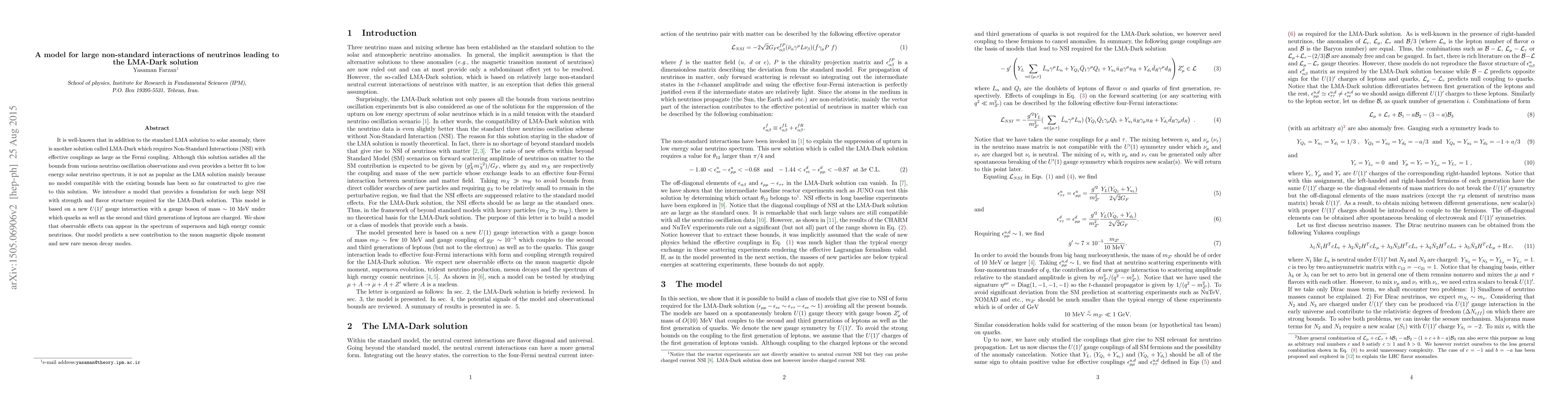 It is well-known that in addition to the standard LMA solution to solar anomaly, there is another solution called LMA-Dark which requires Non-Standard Interactions (NSI) with effective couplings as large as the Fermi coupling. Although this solution satisfies all the bounds from various neutrino oscillation observations and even provides a better fit to low energy solar neutrino spectrum, it is not as popular as the LMA solution mainly because no model compatible with the existing bounds has been so far constructed to give rise to this solution. We introduce a model that provides a foundation for such large NSI with strength and flavor structure required for the LMA-Dark solution. This model is based on a new $U(1)^\prime$ gauge interaction with a gauge boson of mass $\sim 10$ MeV under which quarks as well as the second and third generations of leptons are charged. We show that observable effects can appear in the spectrum of supernova and high energy cosmic neutrinos. Our model predicts a new contribution to the muon magnetic dipole moment and new rare meson decay modes.