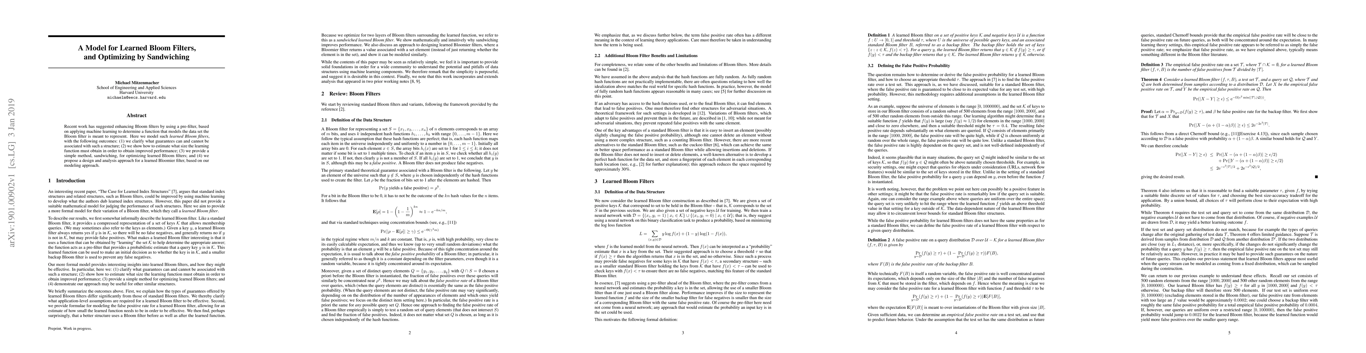 This paper models learned Bloom filters enhanced by machine learning pre-filters and proposes optimization techniques, including a method called sandwiching. It clarifies performance guarantees, estimates necessary function size, and introduces a learned Bloomier filter design.