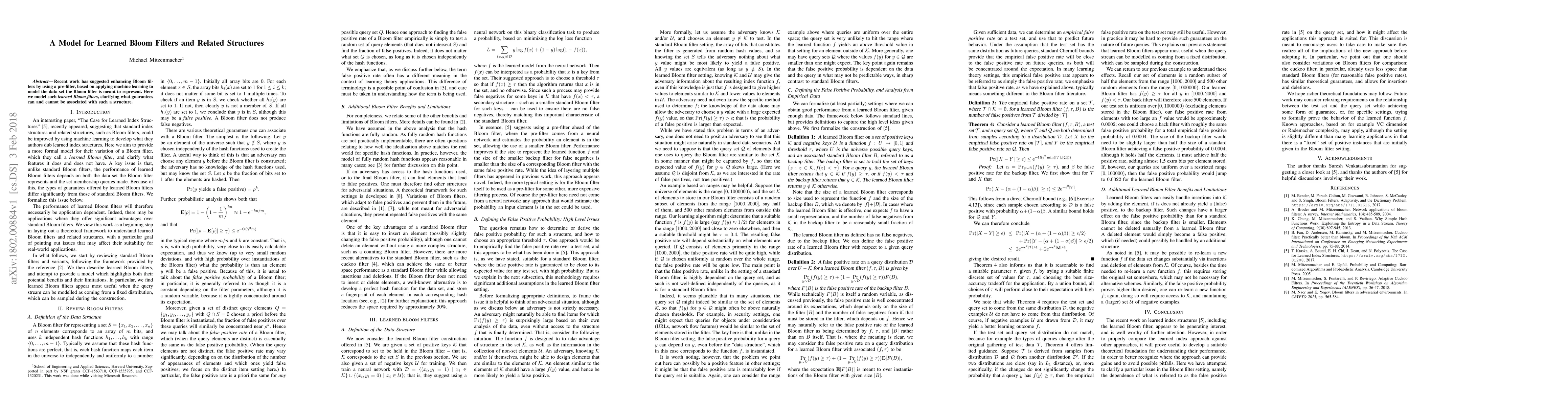 This paper proposes a model for learned Bloom filters enhanced by machine learning pre-filters to better represent datasets, and discusses the associated guarantees and limitations of this approach.