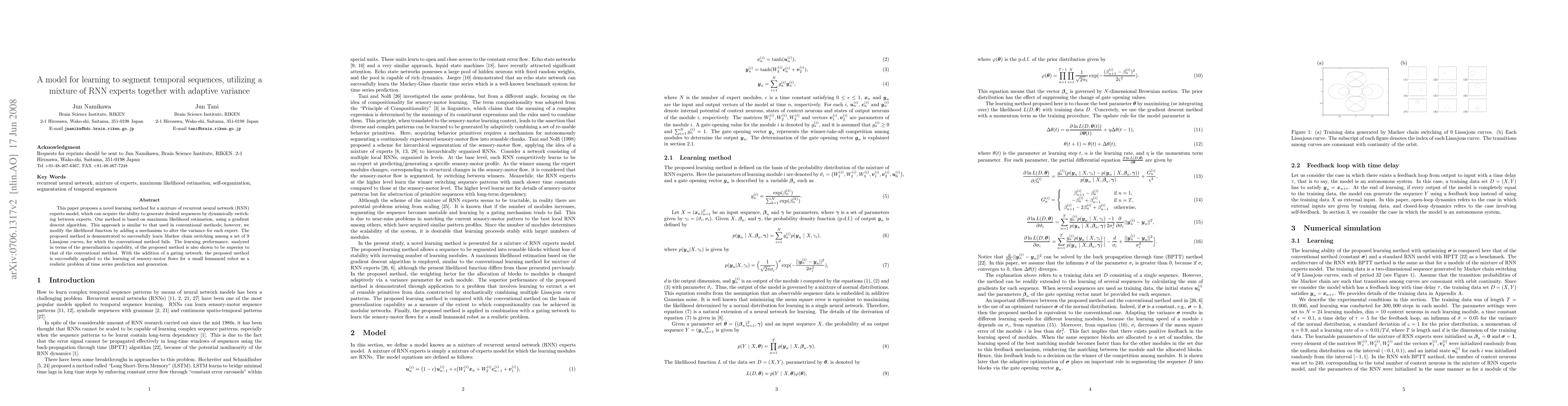 This paper introduces a mixture of RNN experts model with adaptive variance, achieving superior learning performance through dynamic switching between experts and enhanced generalization capabilities. The method successfully segments temporal sequences and outperforms conventional methods in both synthetic and real-world time series prediction tasks.