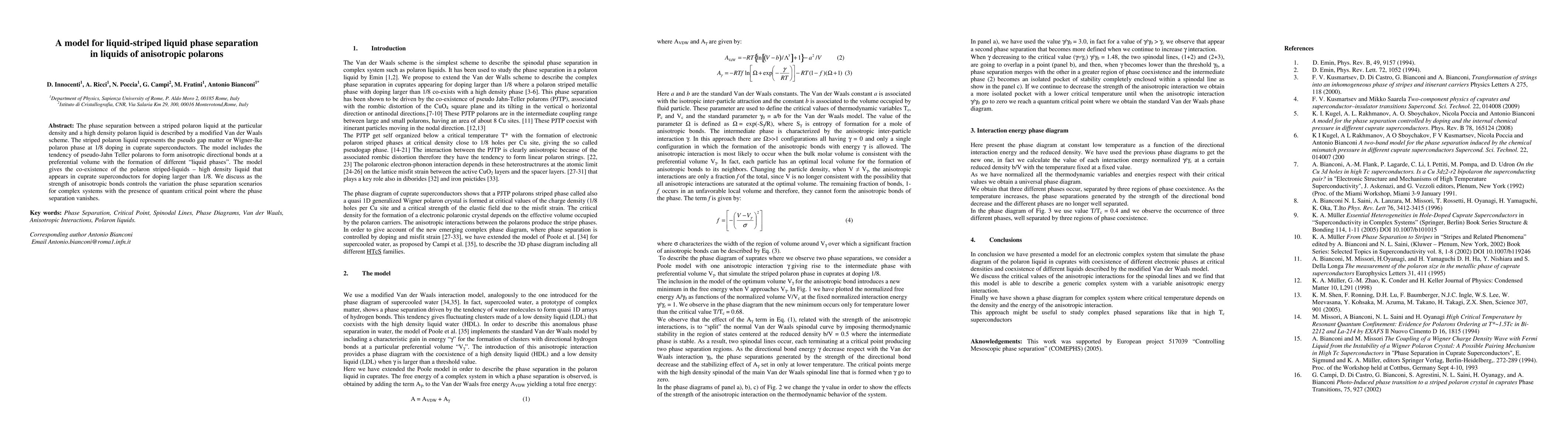 The paper presents a modified Van der Waals model describing phase separation between low-density striped polaron liquid and high-density polaron liquid in anisotropic polarons, particularly in cuprate superconductors at doping levels greater than 1/8. The model highlights the role of anisotropic bonds in determining phase separation behavior near a quantum critical point.