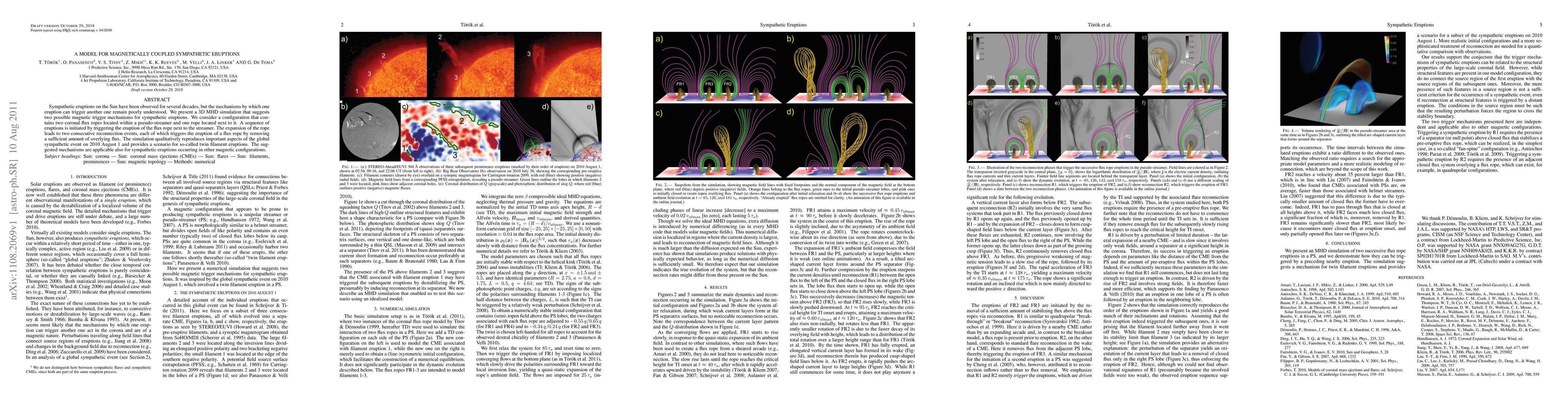 This paper presents a 3D MHD simulation model explaining magnetically coupled sympathetic eruptions on the Sun, proposing two reconnection mechanisms triggered by the expansion of a coronal flux rope. The model reproduces key features of a 2010 August global sympathetic event and suggests applicability to other magnetic configurations.