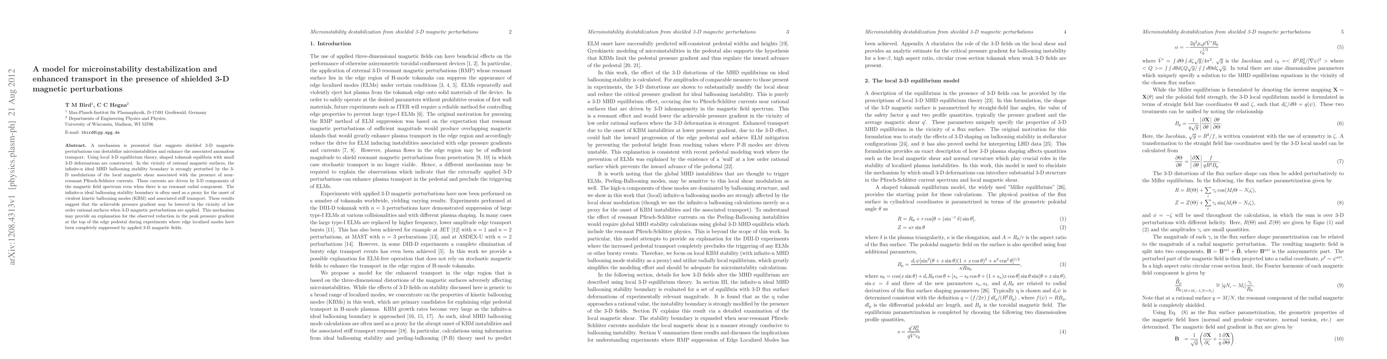 A mechanism is presented that suggests shielded 3-D magnetic perturbations can destabilize microinstabilities and enhance the associated anomalous transport. Using local 3-D equilibrium theory, shaped tokamak equilibria with small 3-D deformations are constructed. In the vicinity of rational magnetic surfaces, the infinite-n ideal MHD ballooning stability boundary is strongly perturbed by the 3-D modulations of the local magnetic shear associated with the presence of nearresonant Pfirsch-Schluter currents. These currents are driven by 3-D components of the magnetic field spectrum even when there is no resonant radial component. The infinite-n ideal ballooning stability boundary is often used as a proxy for the onset of virulent kinetic ballooning modes (KBM) and associated stiff transport. These results suggest that the achievable pressure gradient may be lowered in the vicinity of low order rational surfaces when 3-D magnetic perturbations are applied. This mechanism may provide an explanation for the observed reduction in the peak pressure gradient at the top of the edge pedestal during experiments where edge localized modes have been completely suppressed by applied 3-D magnetic fields.