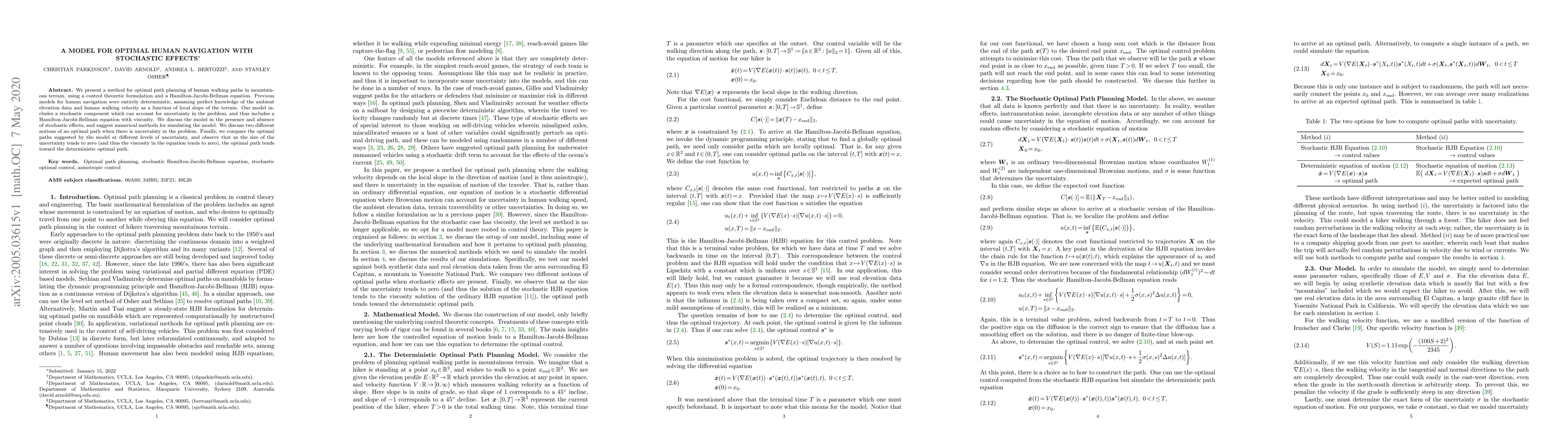 We present a method for optimal path planning of human walking paths in mountainous terrain, using a control theoretic formulation and a Hamilton-Jacobi-Bellman equation. Previous models for human navigation were entirely deterministic, assuming perfect knowledge of the ambient elevation data and human walking velocity as a function of local slope of the terrain. Our model includes a stochastic component which can account for uncertainty in the problem, and thus includes a Hamilton-Jacobi-Bellman equation with viscosity. We discuss the model in the presence and absence of stochastic effects, and suggest numerical methods for simulating the model. We discuss two different notions of an optimal path when there is uncertainty in the problem. Finally, we compare the optimal paths suggested by the model at different levels of uncertainty, and observe that as the size of the uncertainty tends to zero (and thus the viscosity in the equation tends to zero), the optimal path tends toward the deterministic optimal path.