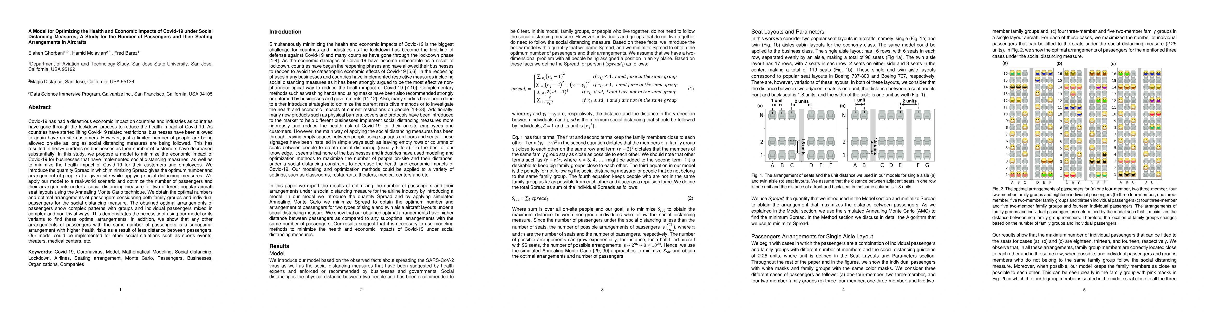 Covid-19 has had a disastrous economic impact on countries and industries as countries have gone through the lockdown process to reduce the health impact of Covid-19. As countries have started lifting Covid-19 related restrictions, businesses have been allowed to again have on-site customers. However, just a limited number of people are being allowed on-site as long as social distancing measures are being followed. This has resulted in heavy burdens on businesses as their number of customers have decreased substantially. In this study, we propose a model to minimize the economic impact of Covid-19 for businesses that have implemented social distancing measures, as well as to minimize the health impact of Covid-19 for their customers and employees. We introduce the quantity Spread in which minimizing Spread gives the optimum number and arrangement of people at a given site while applying social distancing measures. We apply our model to a real-world scenario and optimize the number of passengers and their arrangements under a social distancing measure for two different popular aircraft seat layouts using the Annealing Monte Carlo technique. We obtain the optimal numbers and optimal arrangements of passengers considering both family groups and individual passengers for the social distancing measure. The obtained optimal arrangements of passengers show complex patterns with groups and individual passengers mixed in complex and non-trivial ways. This demonstrates the necessity of using our model or its variants to find these optimal arrangements. In addition, we show that any other arrangements of passengers with the same number of passengers is a suboptimal arrangement with higher health risks as a result of less distance between passengers. Our model could be implemented for other social situations such as sports events, theaters, medical centers, etc.