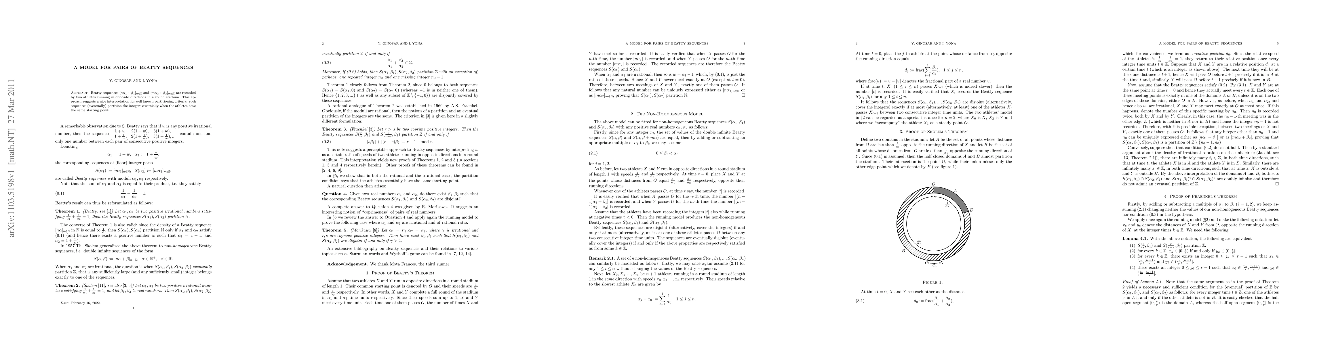 Two Beatty sequences are recorded by athletes running in opposite directions in a round stadium. This approach suggests a nice interpretation for well known partitioning criteria: such sequences (eventually) partition the integers essentially when the athletes have the same starting point.