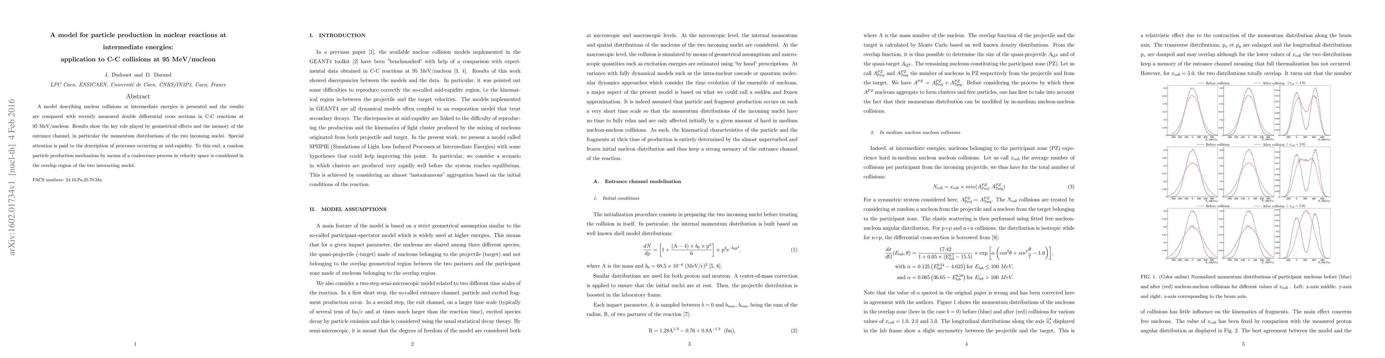 A model describing nuclear collisions at intermediate energies is presented and the results are compared with recently measured double differential cross sections in C-C reactions at 95 MeV/nucleon. Results show the key role played by geometrical effects and the memory of the entrance channel, in particular the momentum distributions of the two incoming nuclei. Special attention is paid to the description of processes occurring at mid-rapidity. To this end, a random particle production mechanism by means of a coalescence process in velocity space is considered in the overlap region of the two interacting nuclei.