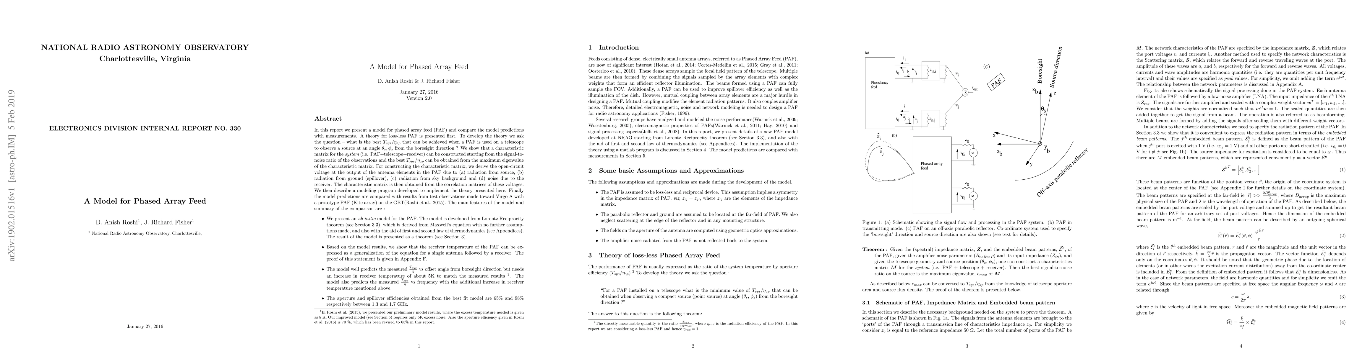 In this report we present a model for phased array feed (PAF) and compare the model predictions with measurements. A theory for loss-less PAF is presented first. To develop the theory we ask the question -- what is the best $T_{sys}/\eta_{ap}$ that can be achieved when a PAF is used on a telescope to observe a source at an angle $\theta_s, \phi_s$ from the boresight direction ? We show that a characteristic matrix for the {\em system} (i.e. PAF+telescope+receiver) can be constructed starting from the signal-to-noise ratio of the observations and the best $T_{sys}/\eta_{ap}$ can be obtained from the maximum eigenvalue of the characteristic matrix. For constructing the characteristic matrix, we derive the open-circuit voltage at the output of the antenna elements in the PAF due to (a) radiation from source, (b) radiation from ground (spillover), (c) radiation from sky background and (d) noise due to the receiver. The characteristic matrix is then obtained from the correlation matrices of these voltages. We then describe a modeling program developed to implement the theory presented here. Finally the model predictions are compared with results from test observations made toward Virgo A with a prototype PAF (Kite array) on the GBT (Roshi et al. 2015).