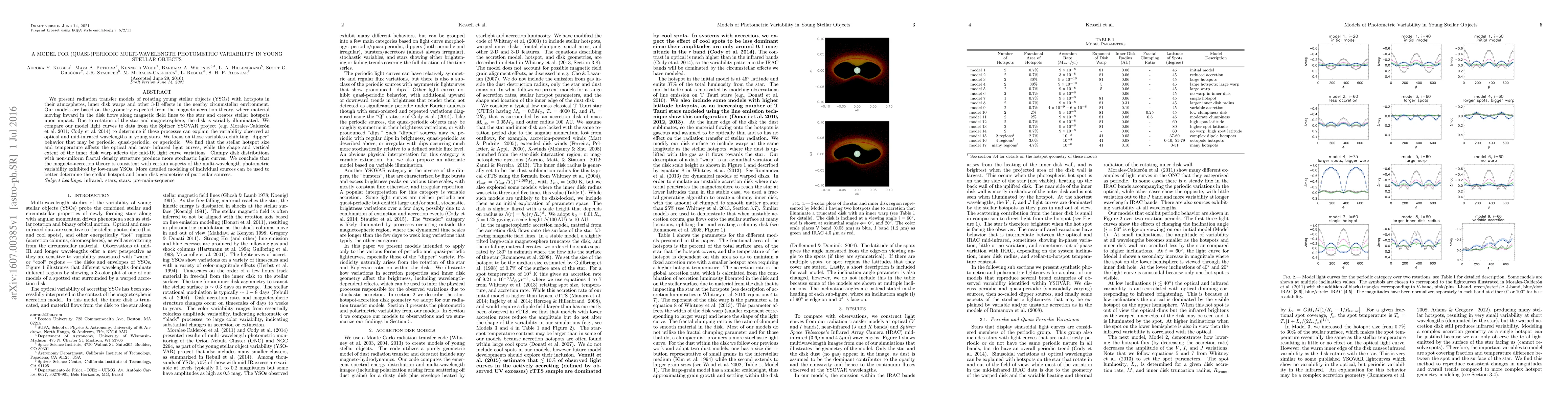 We present radiation transfer models of rotating young stellar objects (YSOs) with hotspots in their atmospheres, inner disk warps and other 3-D effects in the nearby circumstellar environment. Our models are based on the geometry expected from the magneto-accretion theory, where material moving inward in the disk flows along magnetic field lines to the star and creates stellar hotspots upon impact. Due to rotation of the star and magnetosphere, the disk is variably illuminated. We compare our model light curves to data from the Spitzer YSOVAR project (Morales-Calderon et al. 2014, Cody et al. 2014) to determine if these processes can explain the variability observed at optical and mid-infrared wavelengths in young stars. We focus on those variables exhibiting "dipper" behavior that may be periodic, quasi-periodic, or aperiodic. We find that the stellar hotspot size and temperature affects the optical and near-infrared light curves, while the shape and vertical extent of the inner disk warp affects the mid-IR light curve variations. Clumpy disk distributions with non-uniform fractal density structure produce more stochastic light curves. We conclude that the magneto-accretion theory is consistent with certain aspects of the multi-wavelength photometric variability exhibited by low-mass YSOs. More detailed modeling of individual sources can be used to better determine the stellar hotspot and inner disk geometries of particular sources.