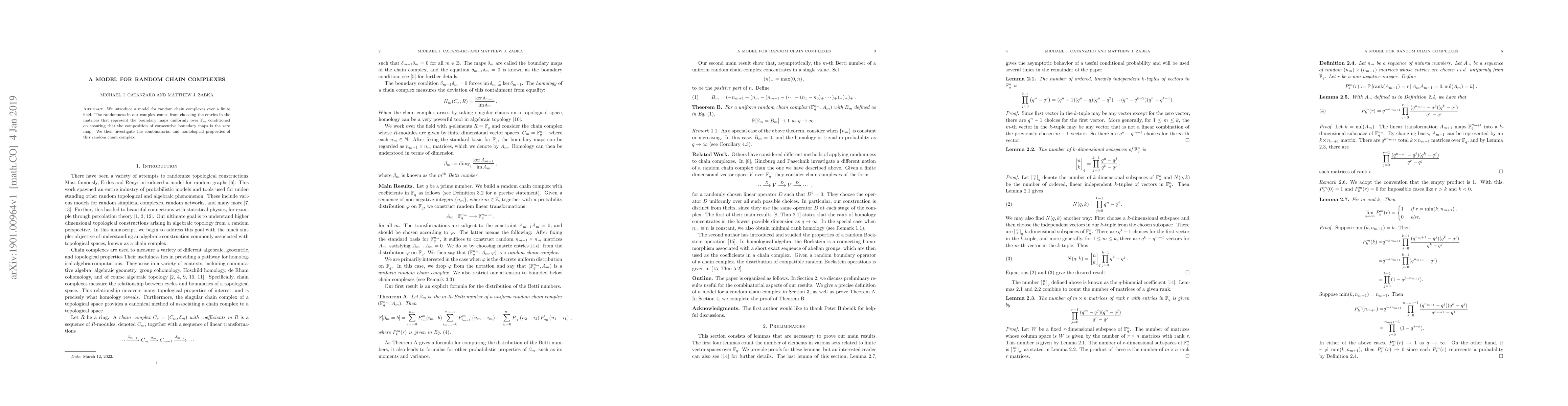 This paper presents a model of random chain complexes over finite fields, where matrix entries representing boundary maps are chosen uniformly from $mathbb{F}_q$, subject to ensuring the composition of consecutive boundary maps equals zero. The research explores the combinatorial and homological characteristics of this random complex.