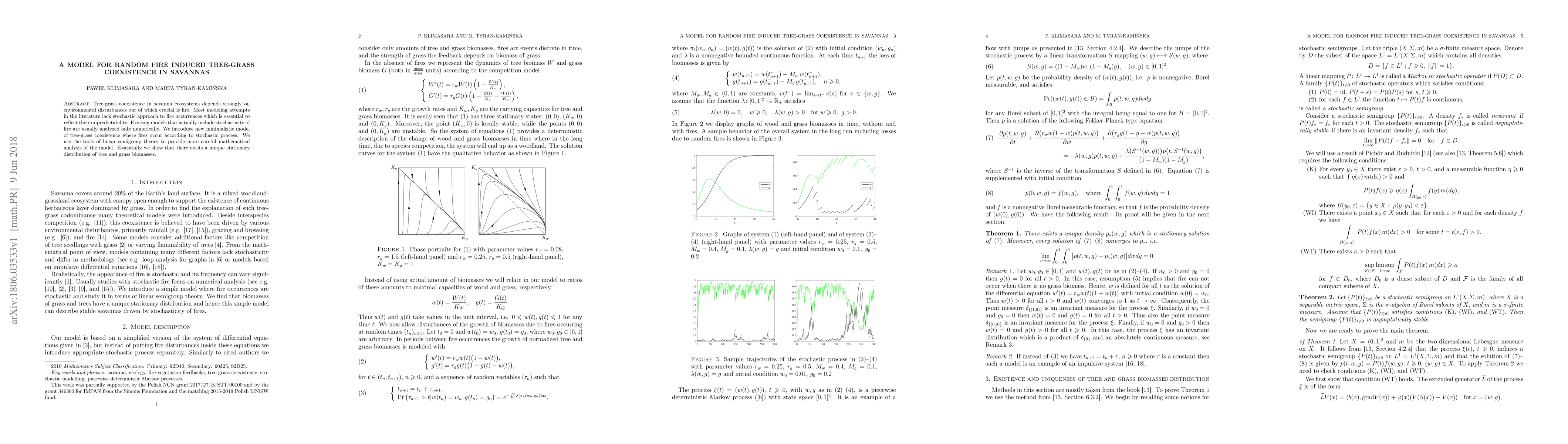 This paper introduces a minimalistic model for tree-grass coexistence in savannas that incorporates a stochastic fire occurrence process. Using linear semigroup theory, the authors demonstrate the existence of a unique stationary distribution for tree and grass biomasses, highlighting the importance of stochastic fire modeling.
