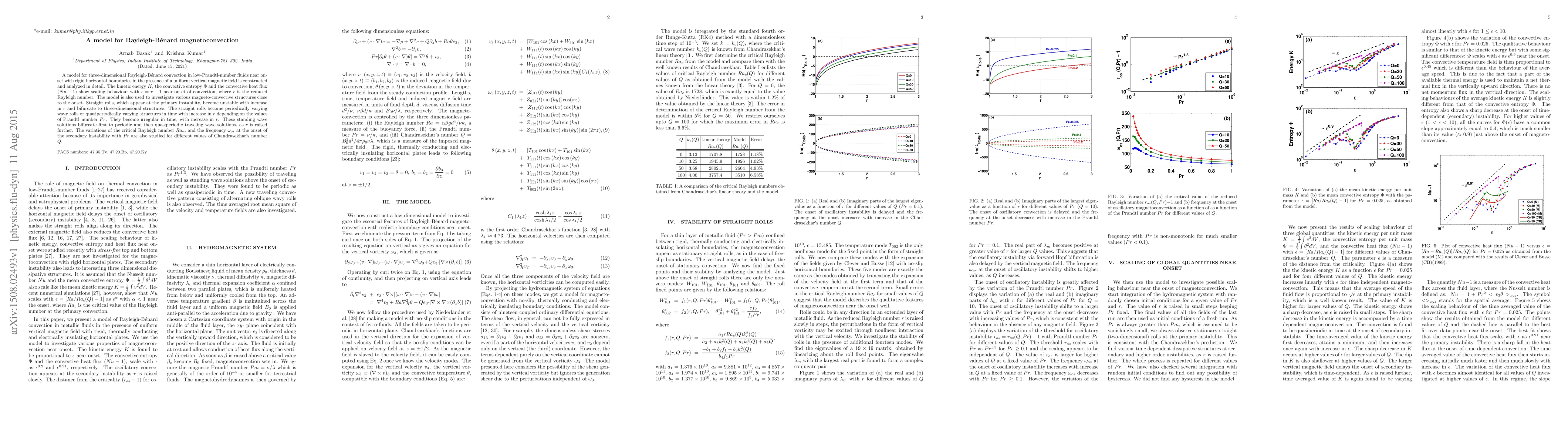 A model for three-dimensional Rayleigh-B\'{e}nard convection in low-Prandtl-number fluids near onset with rigid horizontal boundaries in the presence of a uniform vertical magnetic field is constructed and analyzed in detail. The kinetic energy $K$, the convective entropy $\Phi$ and the convective heat flux ($Nu-1$) show scaling behaviour with $\epsilon = r-1$ near onset of convection, where $r$ is the reduced Rayleigh number. The model is also used to investigate various magneto-convective structures close to the onset. Straight rolls, which appear at the primary instability, become unstable with increase in $r$ and bifurcate to three-dimensional structures. The straight rolls become periodically varying wavy rolls or quasiperiodically varying structures in time with increase in $r$ depending on the values of Prandtl number $Pr$. They become irregular in time, with increase in $r$. These standing wave solutions bifurcate first to periodic and then quasiperiodic traveling wave solutions, as $r$ is raised further. The variations of the critical Rayleigh number $Ra_{os}$ and the frequency $\omega_{os}$ at the onset of the secondary instability with $Pr$ are also studied for different values of Chandrasekhar's number $Q$.