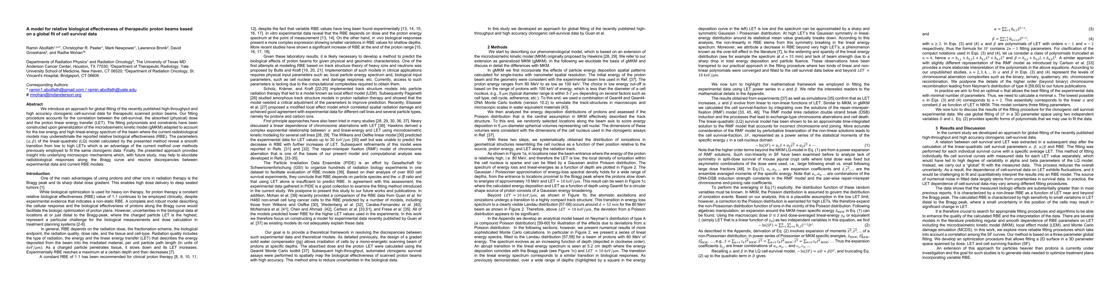 This paper presents a new global fitting model for the relative biological effectiveness (RBE) of therapeutic proton beams, based on high-throughput cell survival data. The method accounts for correlations between cell survival, absorbed dose, and proton linear energy transfer (LET), providing a smooth transition from low to high LETs and potentially resolving discrepancies in current radiobiological models.