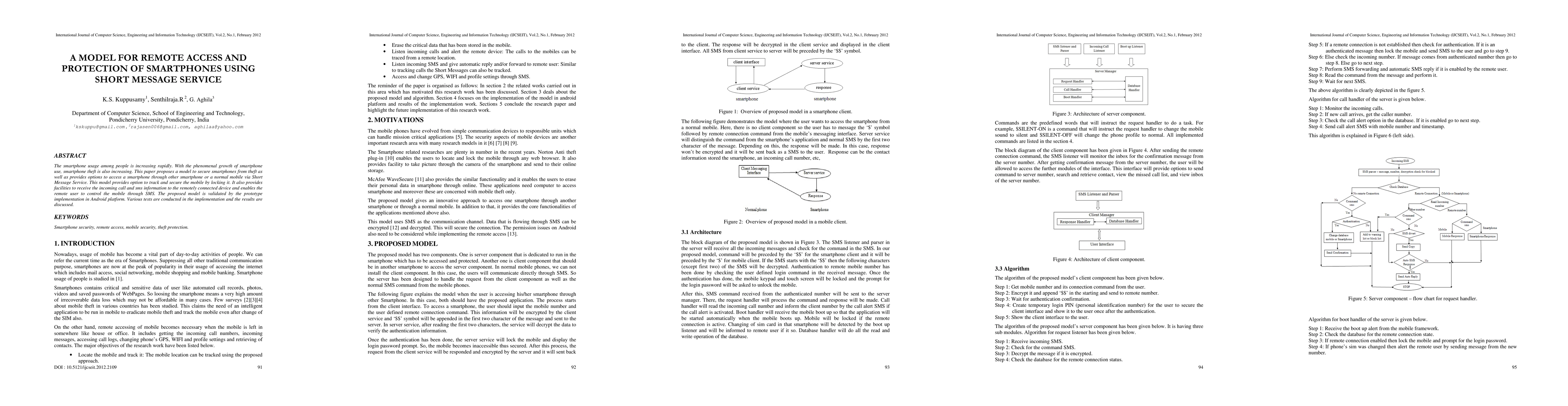 The smartphone usage among people is increasing rapidly. With the phenomenal growth of smartphone use, smartphone theft is also increasing. This paper proposes a model to secure smartphones from theft as well as provides options to access a smartphone through other smartphone or a normal mobile via Short Message Service. This model provides option to track and secure the mobile by locking it. It also provides facilities to receive the incoming call and sms information to the remotely connected device and enables the remote user to control the mobile through SMS. The proposed model is validated by the prototype implementation in Android platform. Various tests are conducted in the implementation and the results are discussed.