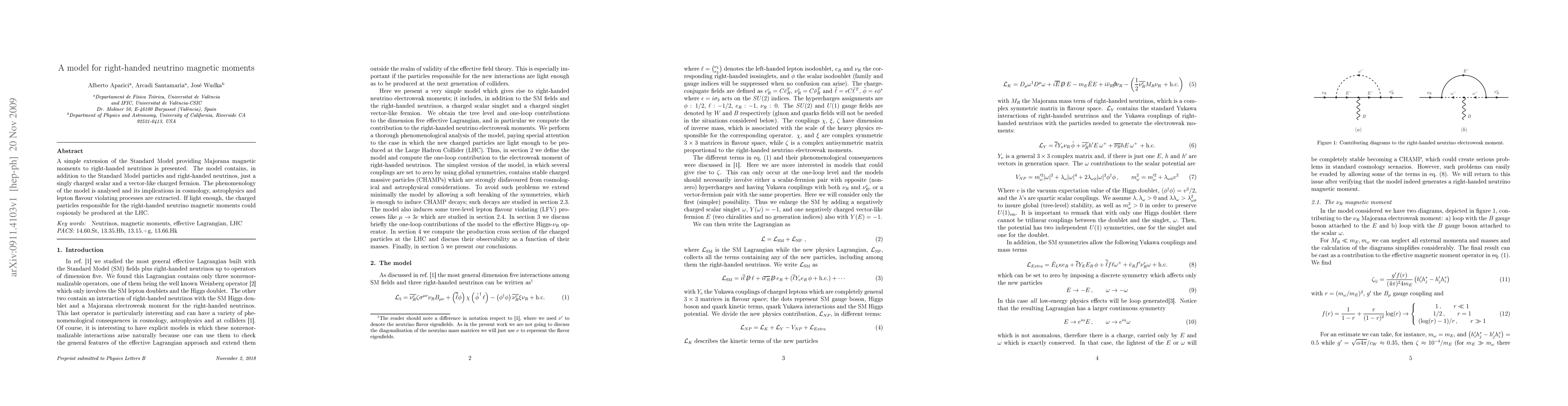 A simple extension of the Standard Model providing Majorana magnetic moments to right-handed neutrinos is presented. The model contains, in addition to the Standard Model particles and right-handed neutrinos, just a singly charged scalar and a vector-like charged fermion. The phenomenology of the model is analysed and its implications in cosmology, astrophysics and lepton flavour violating processes are extracted. If light enough, the charged particles responsible for the right-handed neutrino magnetic moments could copiously be produced at the LHC.