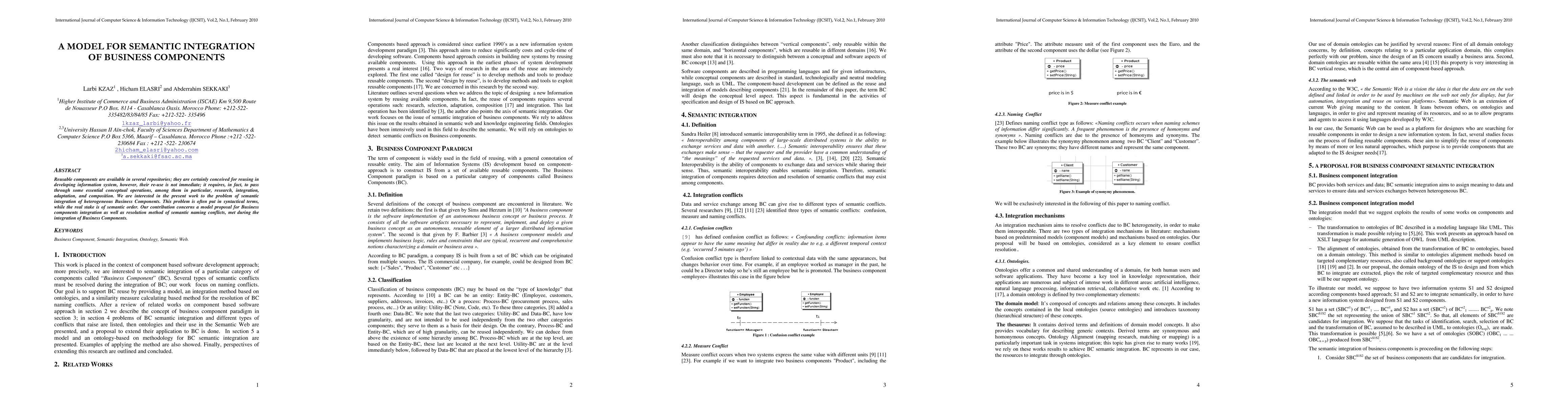 This paper proposes a model for the semantic integration of heterogeneous Business Components, addressing the challenge of resolving semantic naming conflicts that arise during their integration. The model aims to facilitate the reuse of business components through conceptual operations beyond mere syntactical alignment.