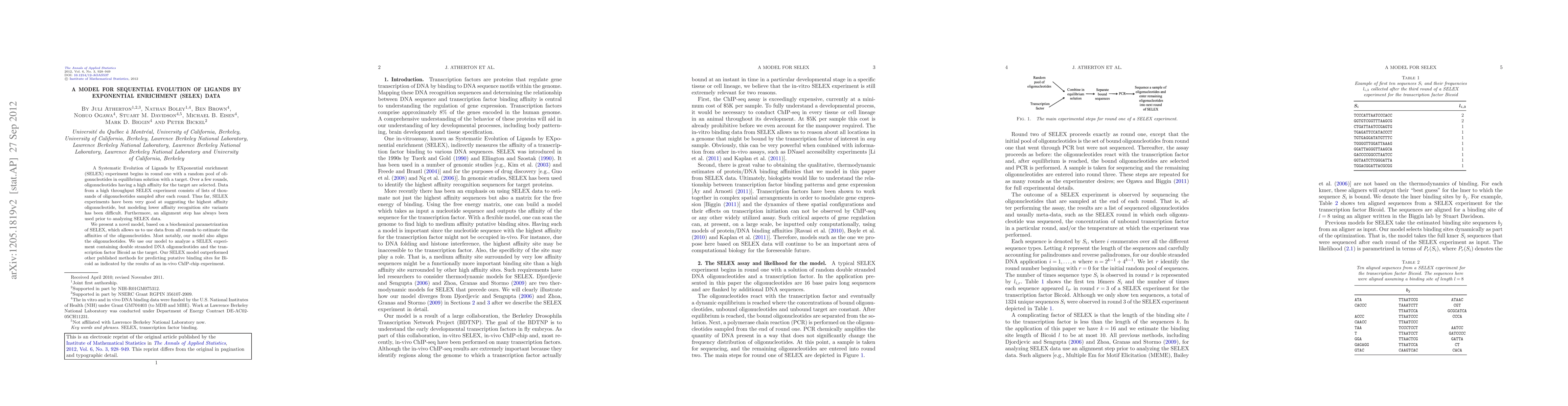 A Systematic Evolution of Ligands by EXponential enrichment (SELEX) experiment begins in round one with a random pool of oligonucleotides in equilibrium solution with a target. Over a few rounds, oligonucleotides having a high affinity for the target are selected. Data from a high throughput SELEX experiment consists of lists of thousands of oligonucleotides sampled after each round. Thus far, SELEX experiments have been very good at suggesting the highest affinity oligonucleotide, but modeling lower affinity recognition site variants has been difficult. Furthermore, an alignment step has always been used prior to analyzing SELEX data. We present a novel model, based on a biochemical parametrization of SELEX, which allows us to use data from all rounds to estimate the affinities of the oligonucleotides. Most notably, our model also aligns the oligonucleotides. We use our model to analyze a SELEX experiment containing double stranded DNA oligonucleotides and the transcription factor Bicoid as the target. Our SELEX model outperformed other published methods for predicting putative binding sites for Bicoid as indicated by the results of an in-vivo ChIP-chip experiment.