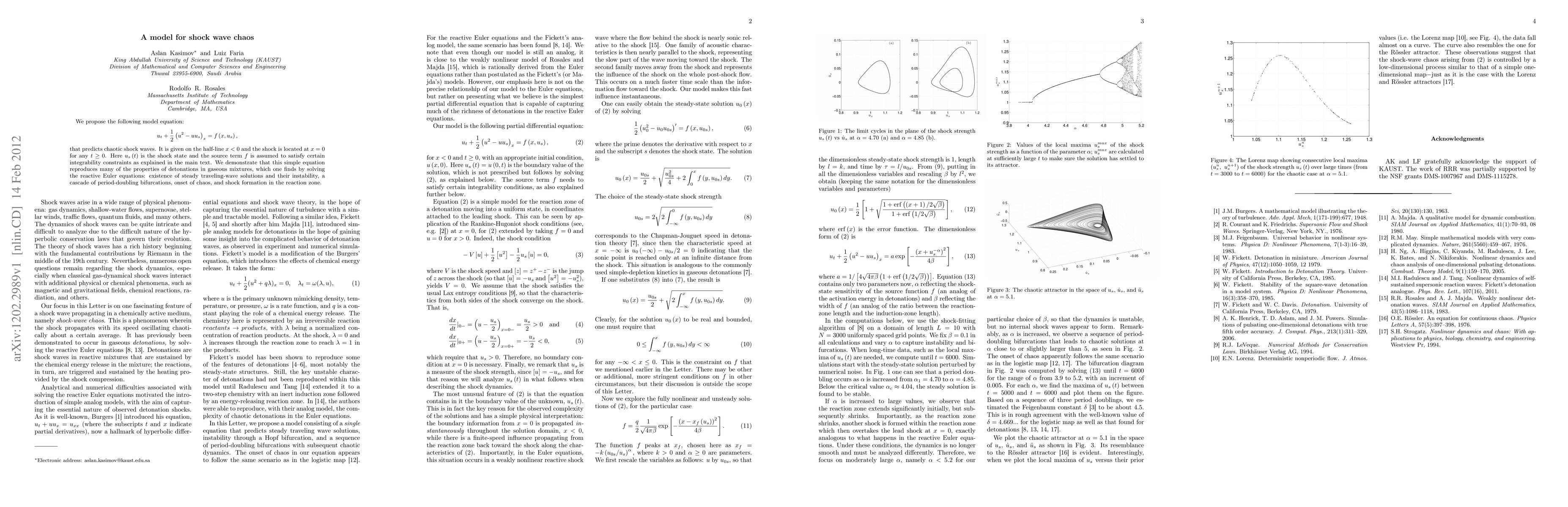 We propose the following model equation: \[u_{t}+1/2(u^{2}-uu_{s})_{x}=f(x,u_{s}), \] that predicts chaotic shock waves. It is given on the half-line $x<0$ and the shock is located at $x=0$ for any $t\ge0$. Here $u_{s}(t)$ is the shock state and the source term $f$ is assumed to satisfy certain integrability constraints as explained in the main text. We demonstrate that this simple equation reproduces many of the properties of detonations in gaseous mixtures, which one finds by solving the reactive Euler equations: existence of steady traveling-wave solutions and their instability, a cascade of period-doubling bifurcations, onset of chaos, and shock formation in the reaction zone.