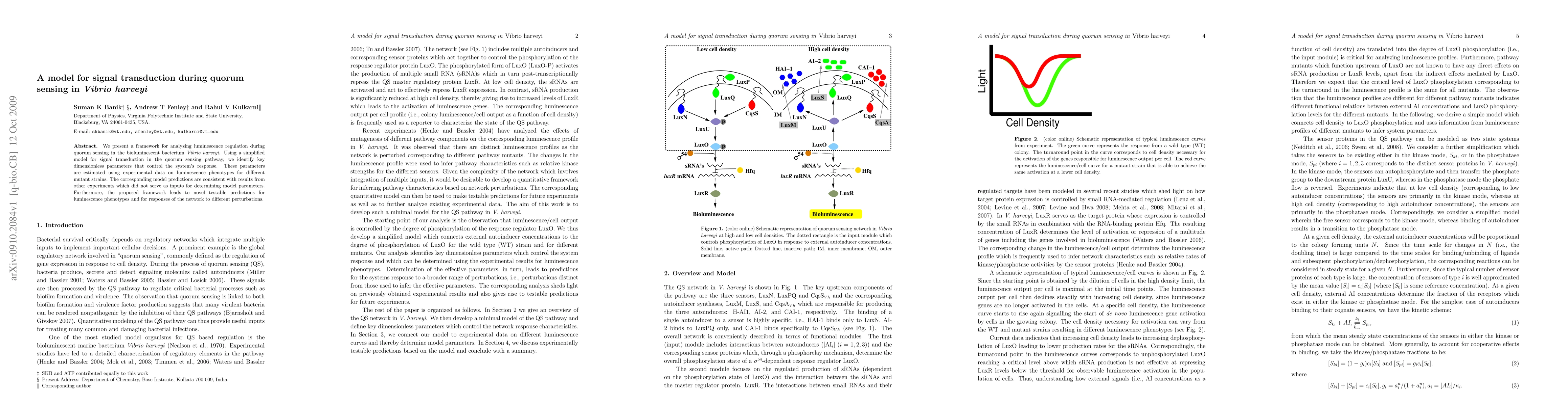 This paper develops a simplified model to analyze quorum sensing in \emph{Vibrio harveyi}, identifying key parameters that govern luminescence regulation. The model's predictions align with experimental data and provide novel insights into the system's response to perturbations.