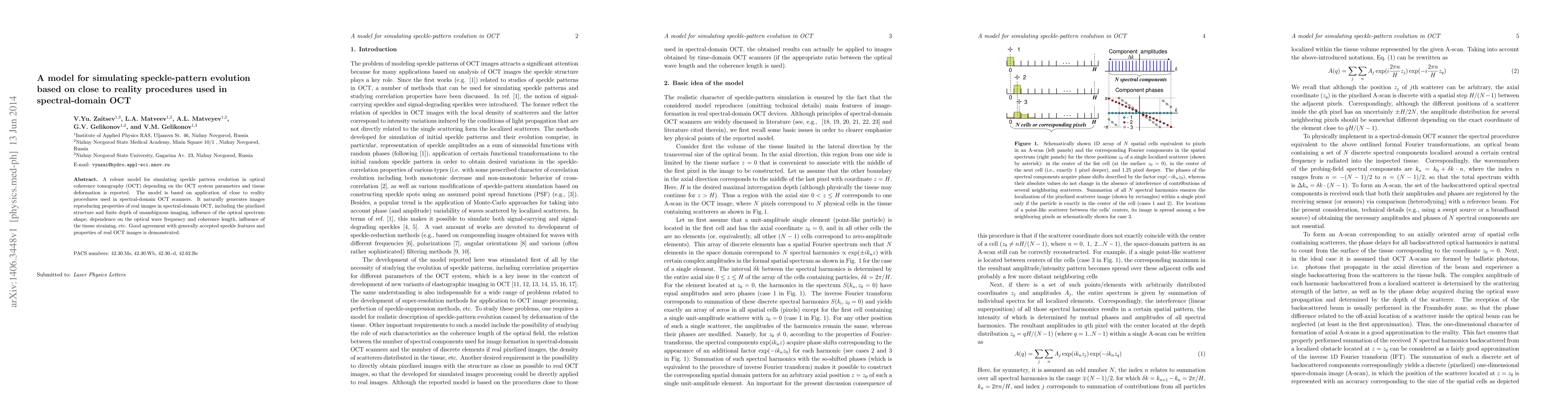 A robust model for simulating speckle pattern evolution in optical coherence tomography (OCT) depending on the OCT system parameters and tissue deformation is reported. The model is based on application of close to reality procedures used in spectral-domain OCT scanners. It naturally generates images reproducing properties of real images in spectral-domain OCT, including the pixelized structure and finite depth of unambiguous imaging, influence of the optical spectrum shape, dependence on the optical wave frequency and coherence length, influence of the tissue straining, etc. Good agreement with generally accepted speckle features and properties of real OCT images is demonstrated.