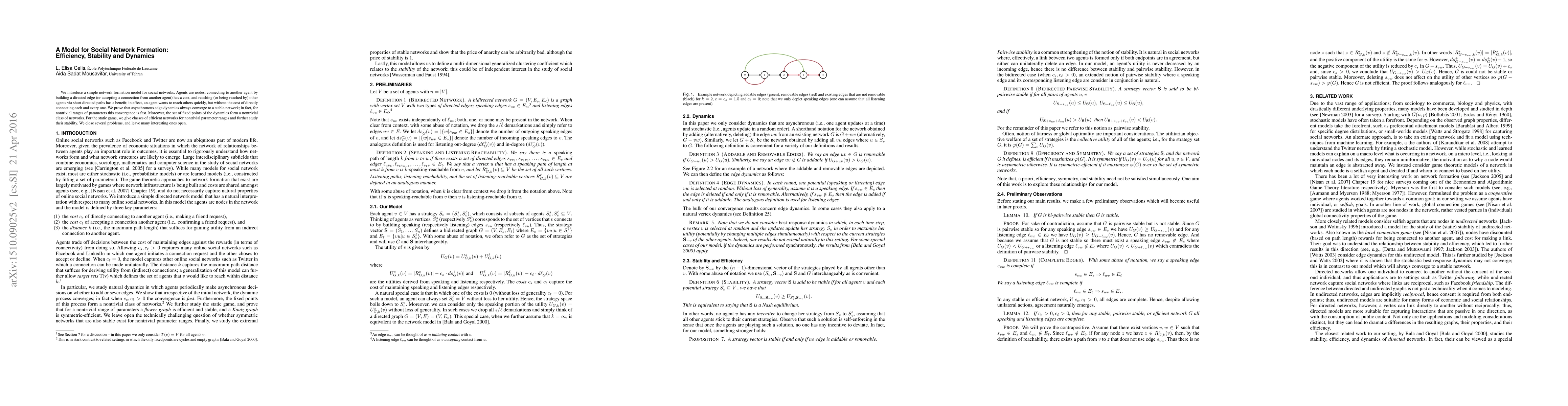 This paper proposes a network formation model for social networks where agents aim to connect efficiently while minimizing costs. The model demonstrates that asynchronous edge dynamics converge to a stable network configuration, with efficient and stable networks identified for various parameter ranges.