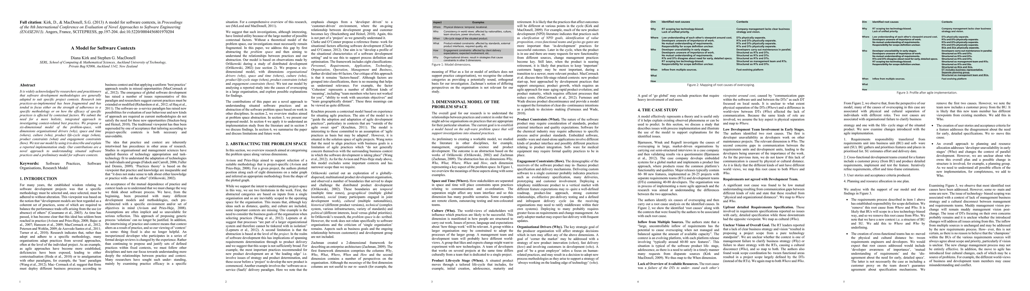 It is widely acknowledged by researchers and practitioners that software development methodologies are generally adapted to suit specific project contexts. Research into practices-as-implemented has been fragmented and has tended to focus either on the strength of adherence to a specific methodology or on how the efficacy of specific practices is affected by contextual factors. We submit the need for a more holistic, integrated approach to investigating context-related best practice. We propose a six-dimensional model of the problem-space, with dimensions organisational drivers (why), space and time (where), culture (who), product life-cycle stage (when), product constraints (what) and engagement constraints (how). We test our model by using it to describe and explain a reported implementation study. Our contributions are a novel approach to understanding situated software practices and a preliminary model for software contexts.
