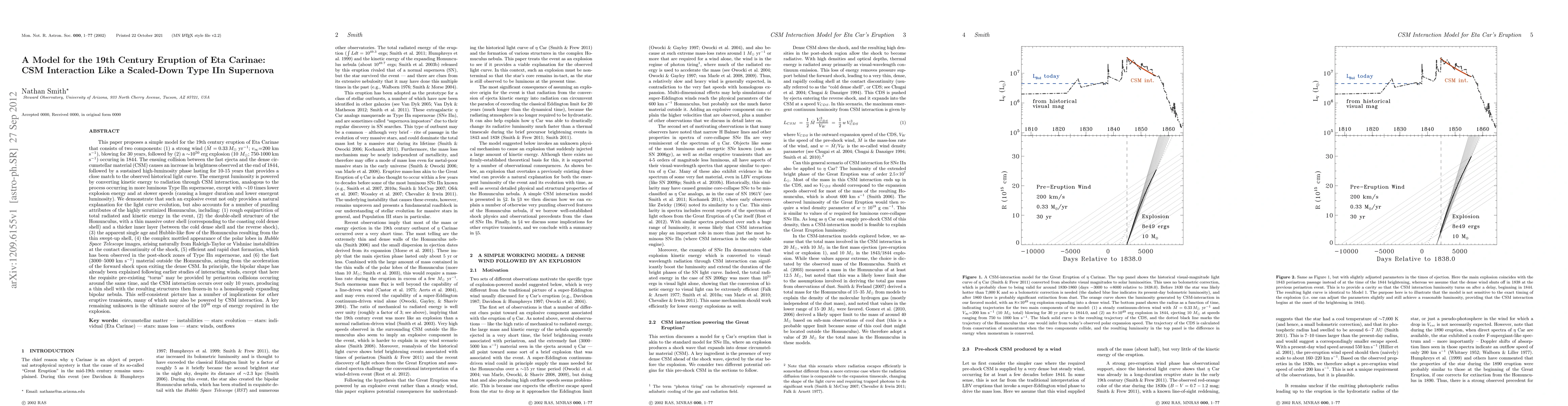 This paper proposes a simple model for the 19th century eruption of Eta Carinae that consists of two components: (1) a strong wind (MdotM=0.33 Msun/yr; v=200 km/s), blowing for 30 years, followed by (2) a 1e50 erg explosion in 1844. The ensuing collision between the fast ejecta and the CSM causes an increase in brightness observed at the end of 1844, followed by a sustained high-luminosity phase lasting for 10-15 years that matches the historical light curve. The emergent luminosity is powered by CSM interaction, analogous to the process in luminous Type IIn supernovae, except with 10 times lower explosion energy and at slower speeds (causing a longer duration and lower emergent luminosity). Such an explosive event provides a natural explanation for the light curve evolution, but also accounts for a number of puzzling attributes of the Homunculus nebula: (1) rough equipartition of total radiated and kinetic energy, (2) the double-shell structure of the Homunculus, (3) the apparent single age and Hubble-like flow resulting from the thin swept-up shell, (4) the complex mottled appearance of the polar lobes in HST images, arising from Raleigh-Taylor or Vishniac instabilities, (5) efficient and rapid dust formation, as seen in Type IIn supernovae, and (6) the fast (5000 km/s) material outside the Homunculus, arising from the acceleration of the forward shock upon exiting the dense CSM. In principle, the bipolar shape has already been explained in earlier studies of interacting winds, except that here the CSM interaction occurs over only 10 years, producing a thin shell with the resulting structures then frozen-in to the expanding bipolar nebula. This self-consistent picture has a number of implications for other eruptive transients, many of which may also be powered by CSM interaction.