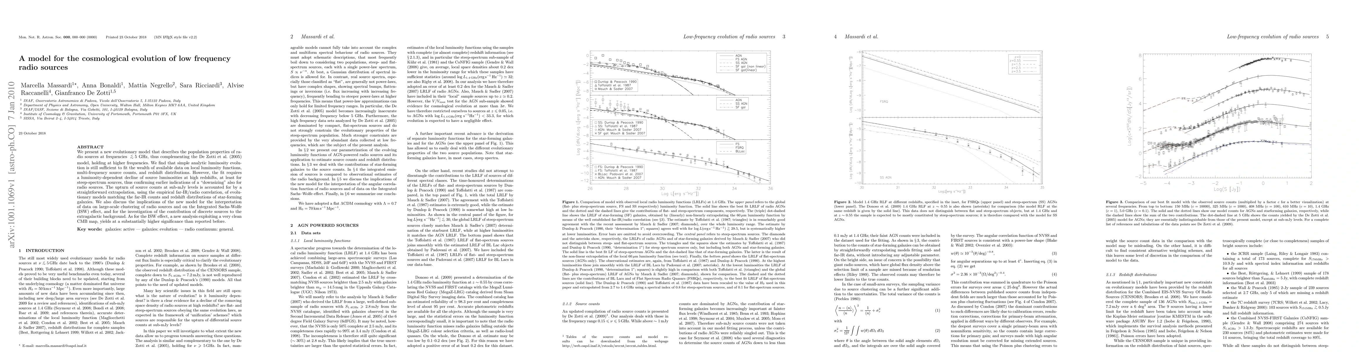We present a new evolutionary model that describes the population properties of radio sources at frequencies <5 GHz, thus complementing the De Zotti et al. (2005) model, holding at higher frequencies. We find that simple analytic luminosity evolution is still sufficient to fit the wealth of available data on local luminosity functions, multi-frequency source counts, and redshift distributions. However, the fit requires a luminosity-dependent decline of source luminosities at high redshifts, at least for steep-spectrum sources, thus confirming earlier indications of a "downsizing" also for radio sources. The upturn of source counts at sub-mJy levels is accounted for by a straightforward extrapolation, using the empirical far-IR/radio correlation, of evolutionary models matching the far-IR counts and redshift distributions of star-forming galaxies. We also discuss the implications of the new model for the interpretation of data on large-scale clustering of radio sources and on the Integrated Sachs-Wolfe (ISW) effect, and for the investigation of the contribution of discrete sources to the extragalactic background. As for the ISW effect, a new analysis exploiting a very clean CMB map, yields at a substantially higher significance than reported before.