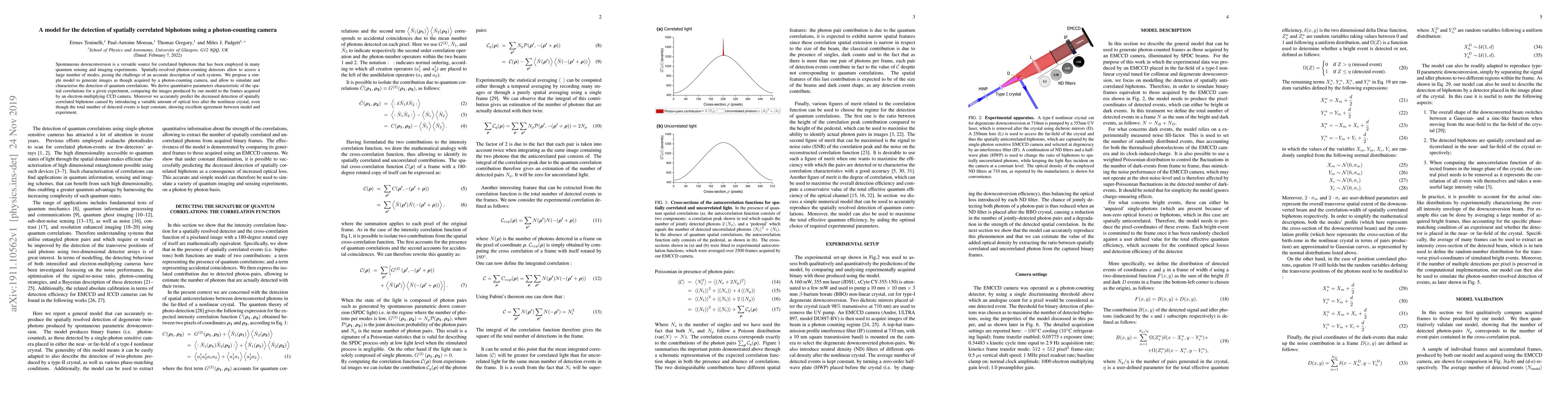 Spontaneous downconversion is a versatile source for correlated biphotons that has been employed in many quantum sensing and imaging experiments. Spatially-resolved photon-counting detectors allow to access a large number of modes, posing the challenge of an accurate description of such systems. We propose a simple model to generate images as though acquired by a photon-counting camera, and allow to simulate and characterise the detection of quantum correlations. We derive quantitative parameters characteristic of the spatial correlations for a given experiment, comparing the images produced by our model to the frames acquired by an electron-multiplying CCD camera. Moreover we accurately predict the decreased detection of spatially correlated biphotons caused by introducing a variable amount of optical loss after the nonlinear crystal, even though the total number of detected events is kept constant, showing excellent agreement between model and experiment.