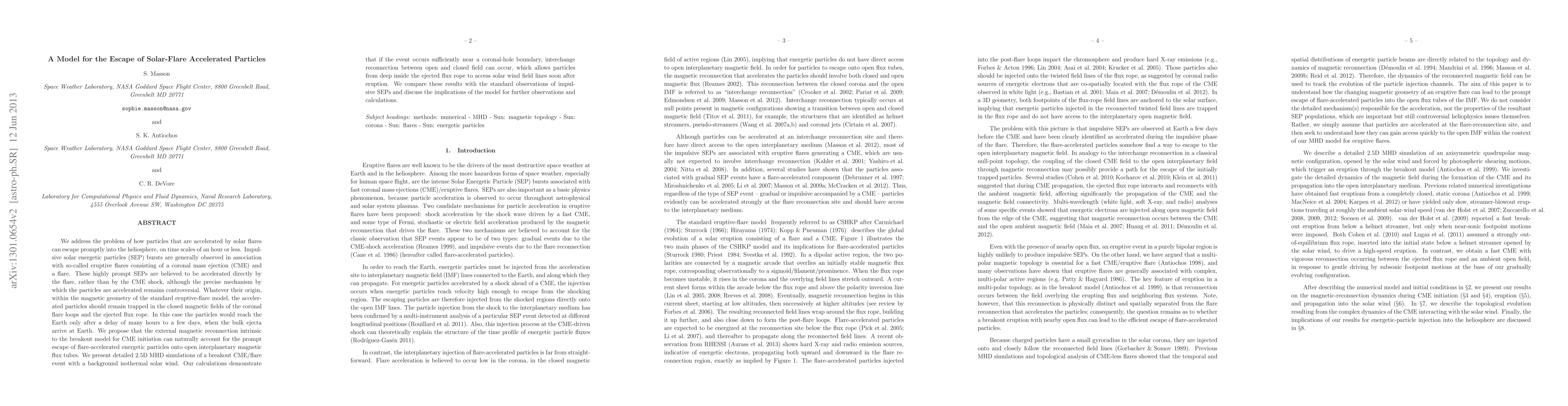 This paper proposes a model explaining the prompt escape of solar-flare accelerated particles into the heliosphere, suggesting that external magnetic reconnection in the breakout CME initiation model allows particles to escape onto open interplanetary magnetic flux tubes. The authors use 2.5D MHD simulations to demonstrate this mechanism near coronal-hole boundaries, comparing their findings with observations of impulsive solar energetic particles.