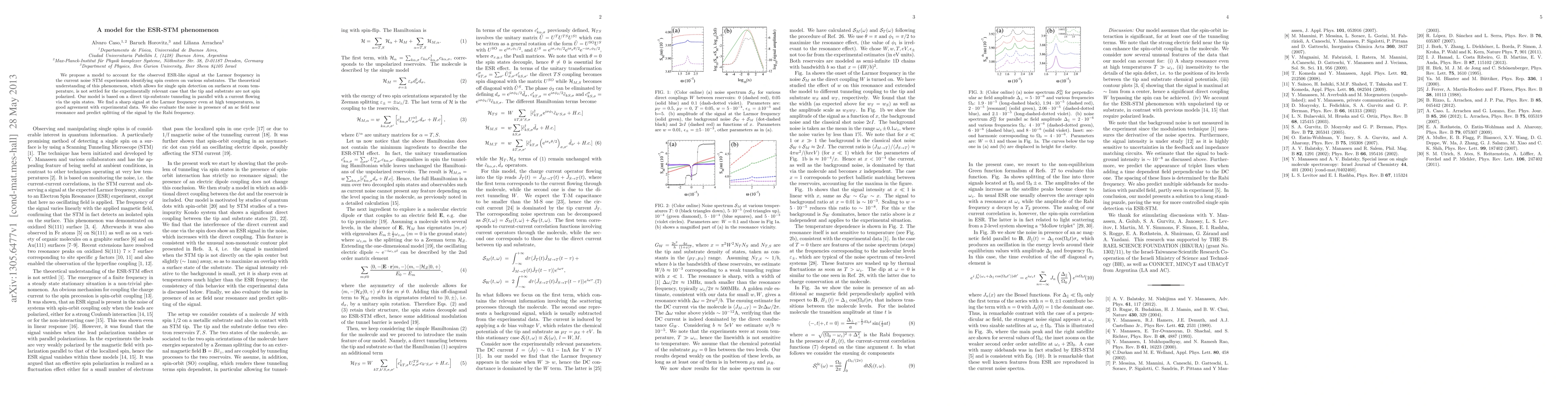 This paper proposes a model explaining the ESR-like signal observed in STM experiments at the Larmor frequency, enabling single spin detection on surfaces at room temperature. The model suggests direct tip-substrate tunneling alongside spin-state mediated current, predicting a sharp signal at the Larmor frequency and signal splitting by the Rabi frequency in the presence of an ac field.