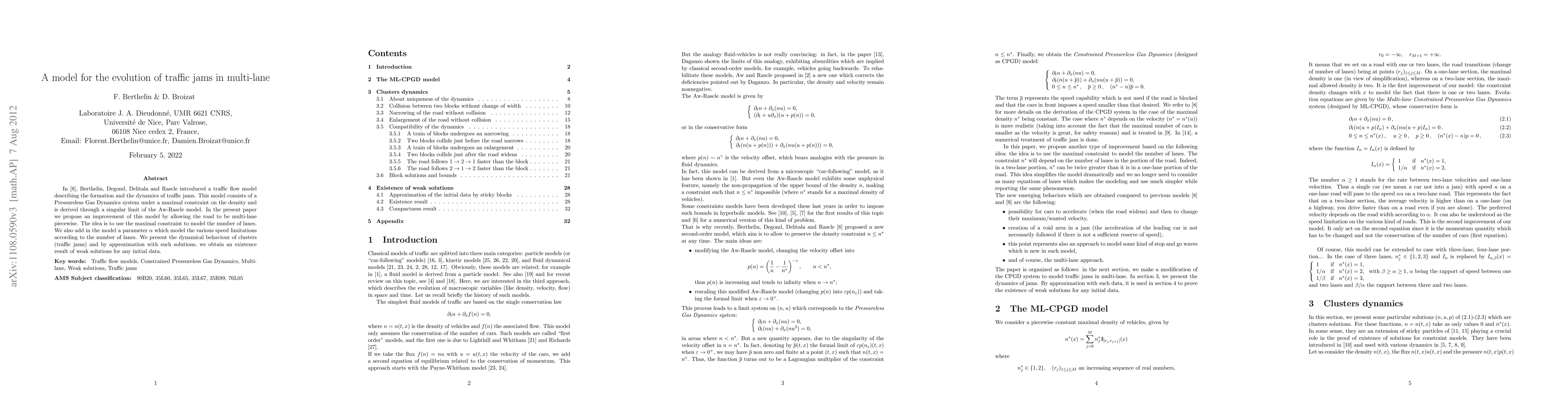 This paper improves a traffic flow model by adapting it to multi-lane roads, incorporating a parameter to account for speed limitations based on lane number. It demonstrates the dynamical behavior of traffic jams and proves the existence of weak solutions for any initial data.