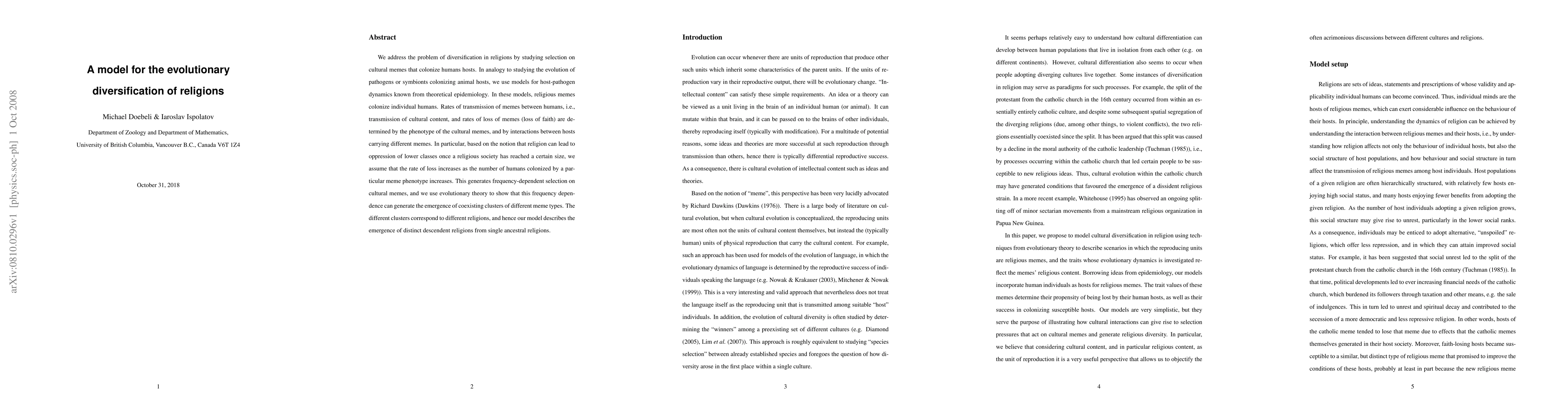 This paper proposes a theoretical model using host-pathogen dynamics to explain the evolutionary diversification of religions, showing how frequency-dependent selection on cultural memes can lead to the emergence of distinct religious clusters from a single ancestral religion. The model highlights the role of social dynamics, such as the oppression of lower classes, in the loss of faith and the emergence of new religious types.