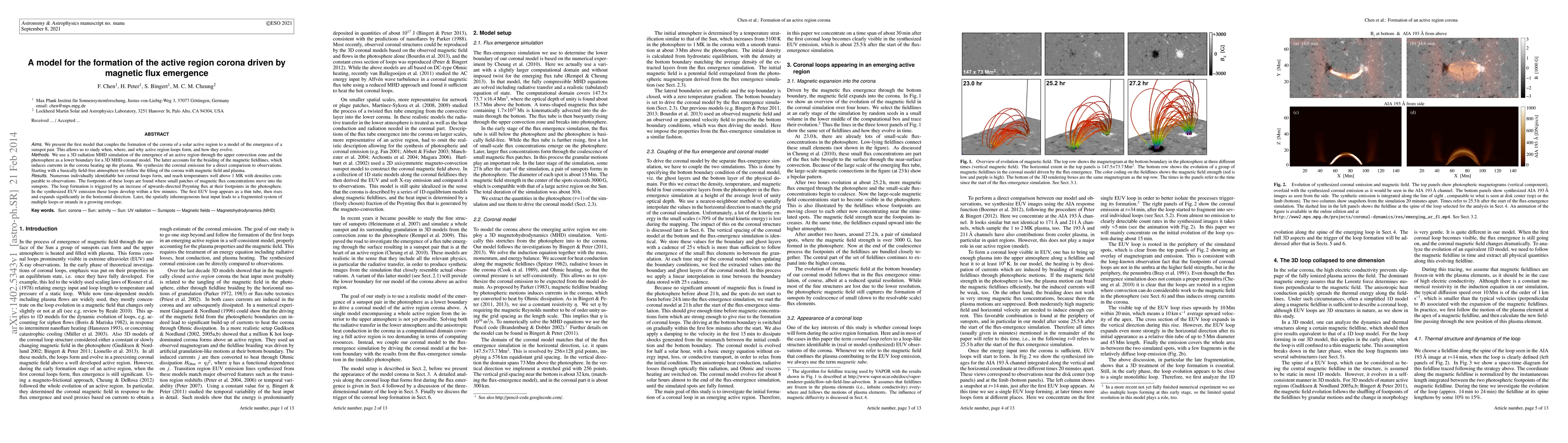 This paper introduces a model linking the formation of solar active region coronas to sunspot emergence, using a 3D radiation MHD simulation. The model shows how coronal loops form and evolve due to magnetic field braiding and heating, producing temperatures and densities consistent with observations.