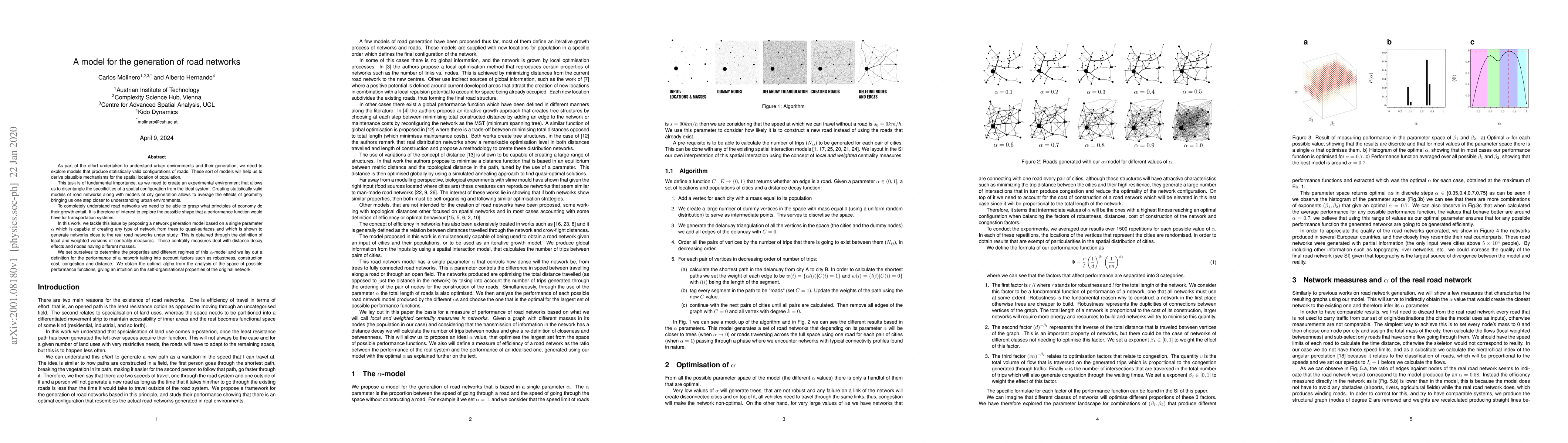 As part of the effort undertaken to understand urban environments and their generation, we need to explore models that produce statistically valid configurations of roads. These sort of models will help us to derive plausible mechanisms for the spatial location of population. This task is of fundamental importance, as we need to create an experimental environment that allows us to disentangle the specificities of a spatial configuration from the ideal system. Creating statistically valid models of road networks along with models of city generation allows to average the effects of geometry bringing us one step closer to understanding urban environments. To completely understand road networks we need to be able to grasp what principles of economy do their growth entail. It is therefore of interest to explore the possible shape that a performance function would have for transportation systems. In this work, we tackle this issue by proposing a network generation model based on a single parameter $\alpha$ which is capable of creating any type of network from trees to quasi-surfaces and which is shown to generate networks close to the real road networks under study. This is obtained through the definition of local and weighted versions of centrality measures. These centrality measures deal with distance-decay effects and nodes having different masses. We set ourselves to determine the properties and different regimes of this $\alpha$-model and we lay out a definition for the performance of a network taking into account factors such as robustness, construction cost, congestion and distance. We obtain the optimal alpha from the analysis of the space of possible performance functions, giving an intuition on the self-organisational properties of the original network.
