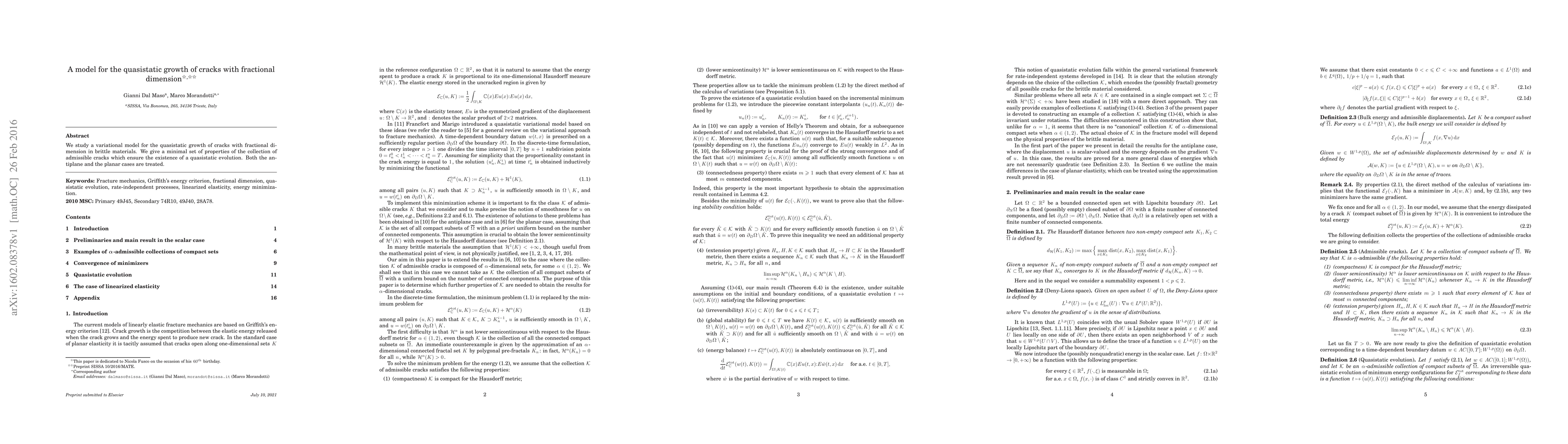 We study a variational model for the quasistatic growth of cracks with fractional di- mension in brittle materials. We give a minimal set of properties of the collection of admissible cracks which ensure the existence of a quasistatic evolution. Both the an- tiplane and the planar cases are treated.